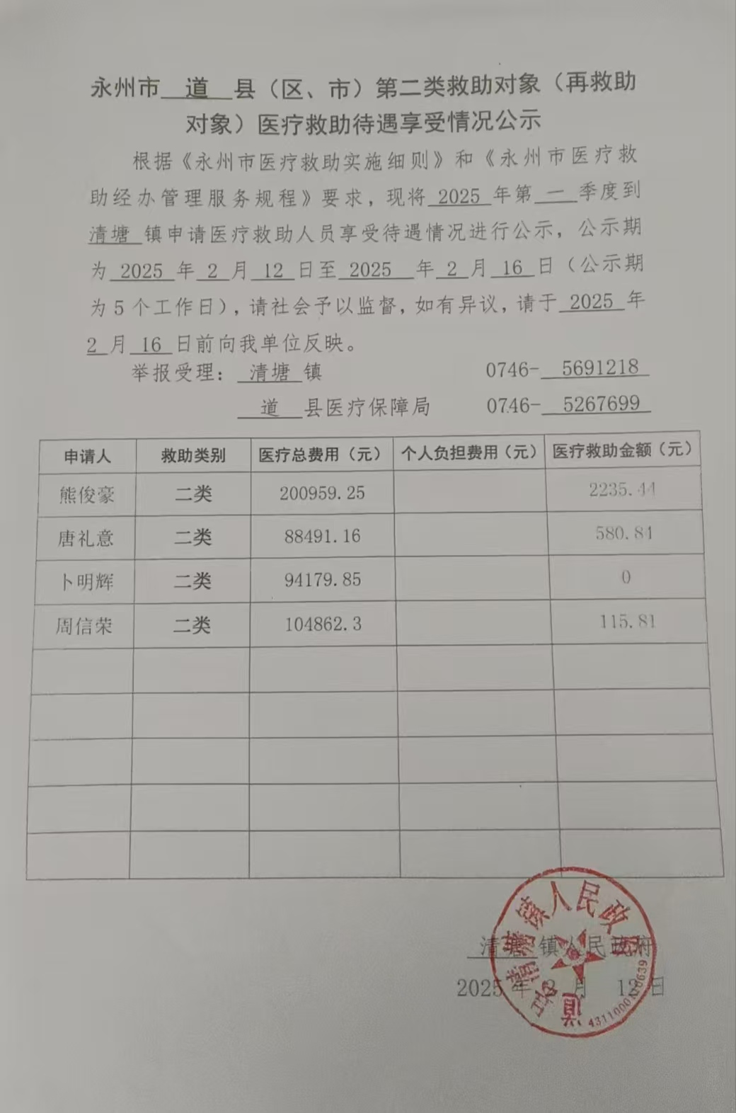 永州市道县清塘镇第二类救助对象(再救助对象)医疗救助待遇享受情况公示