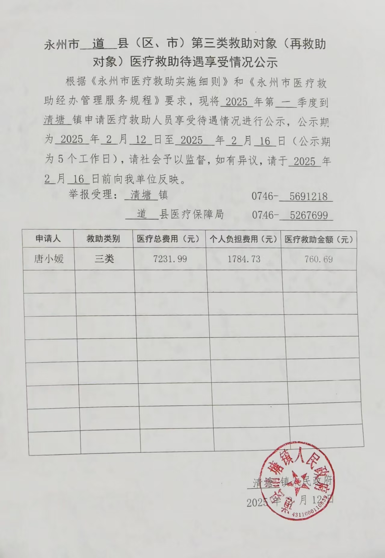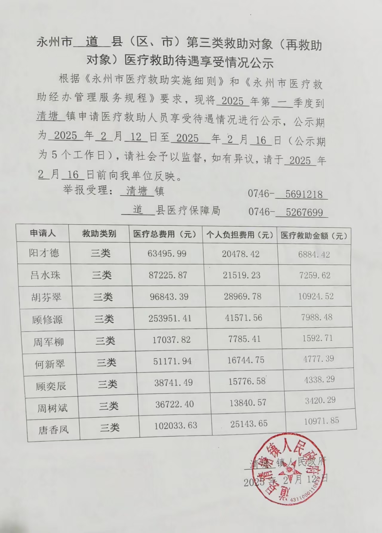 永州市道县清塘镇第三类救助对象(再救助对象)医疗救助待遇享受情况公示