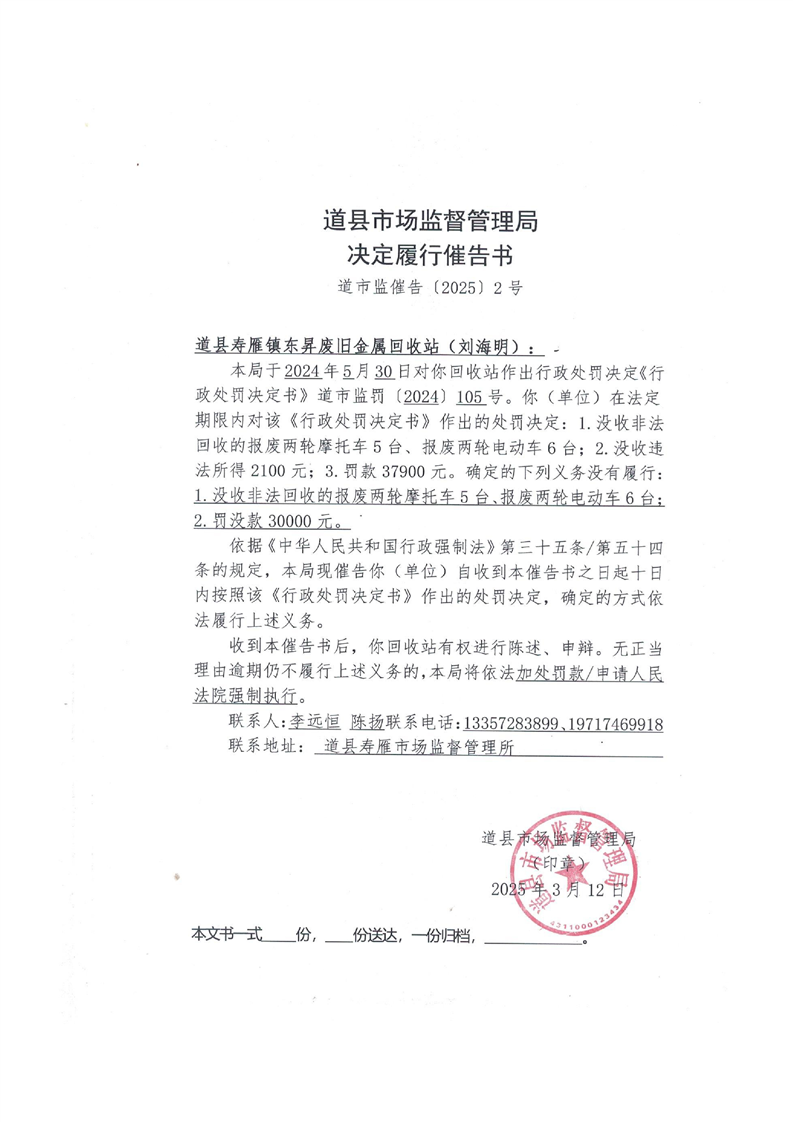 道县市场监督管理局决定履行催告书