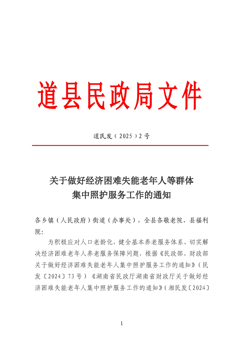 道县上关街道转发县民政局《关于做好经济困难失能老年人等群体集中照护服务工作的通知》