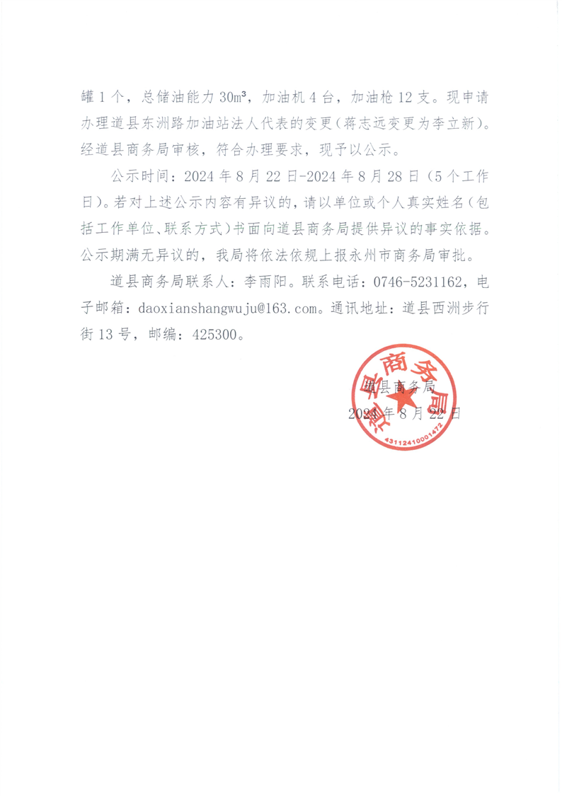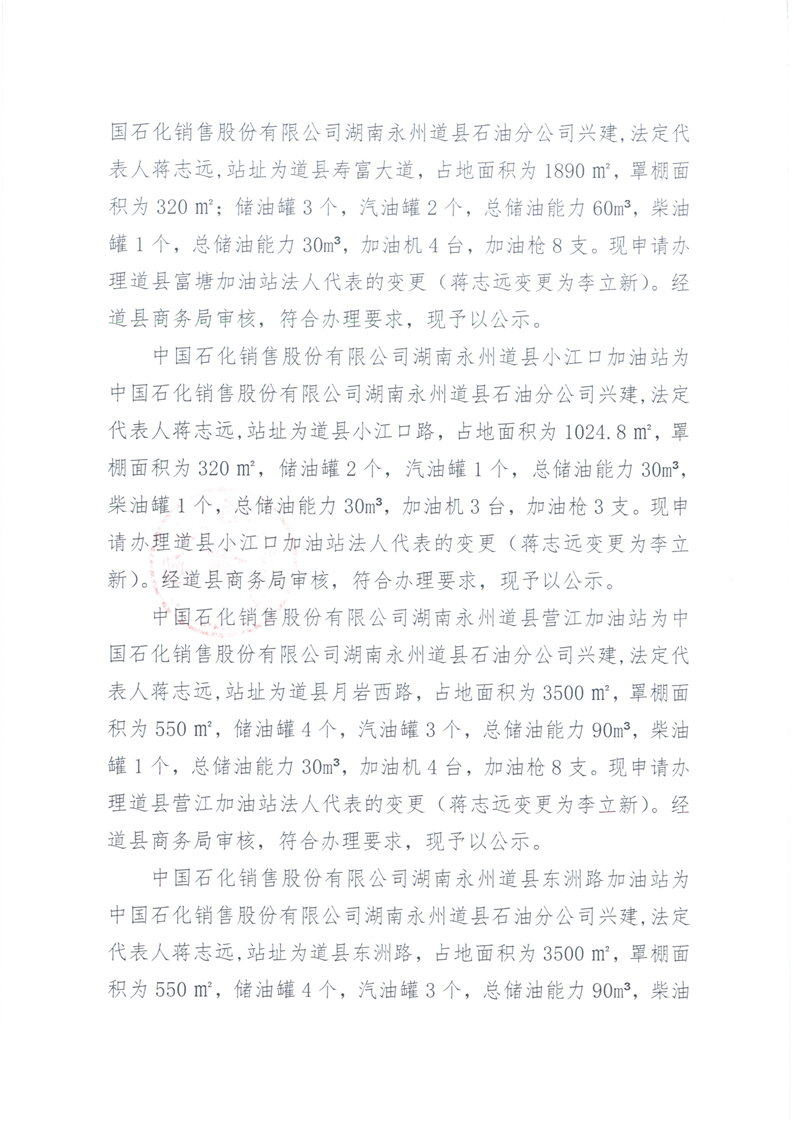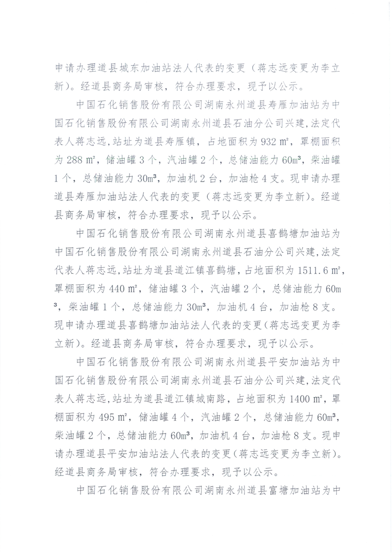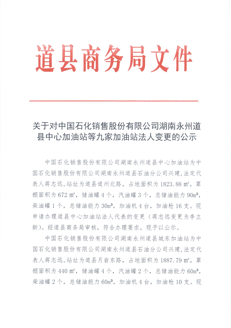 关于对中国石化销售股份有限公司湖南永州道县中心加油站等九家加油站法人变更的公示