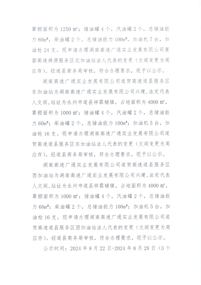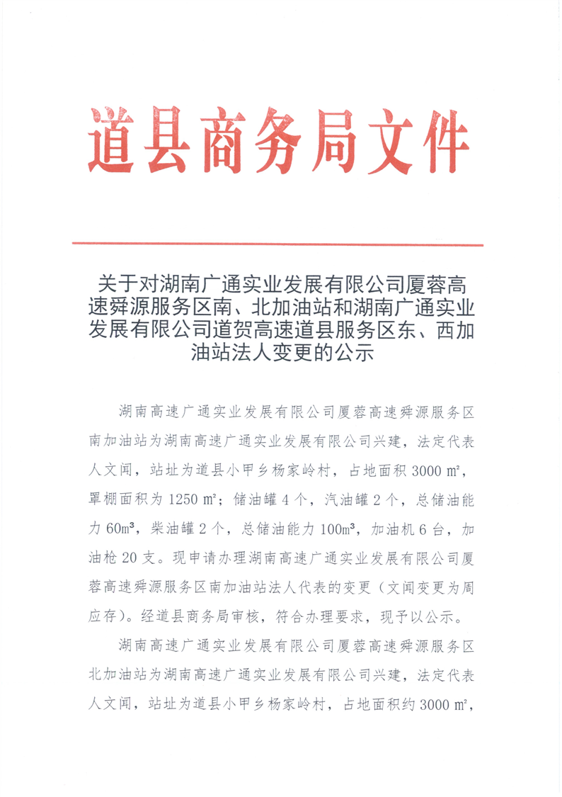 关于对湖南广通实业发展有限公司厦蓉高速舜源服务区南、北加油站和湖南广通实业发展有限公司道贺高速道县服务区东、西加油站法人变更的公示