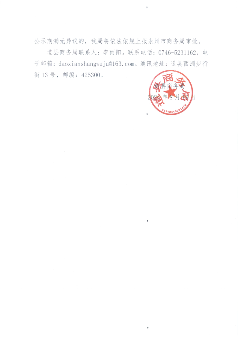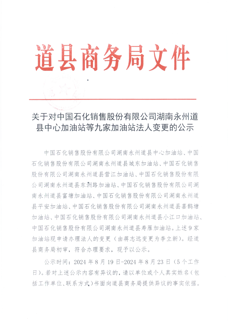 关于对中国石化销售股份有限公司湖南永州道县中心加油站等九家加油站法人变更的公示