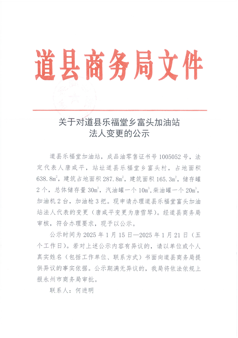 关于对道县乐福堂乡富头加油站法人变更的公示