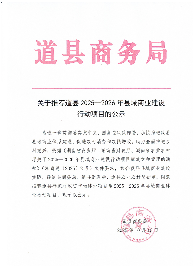 关于推荐道县2025-2026年县域商业建设行动项目的公示