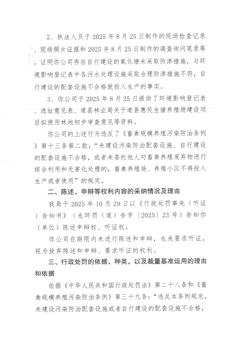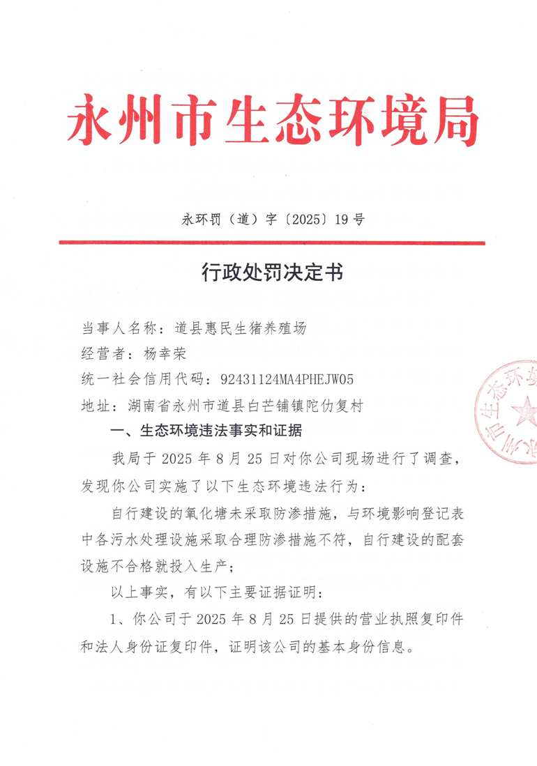 关于对道县惠民生猪养殖场的行政处罚决定书