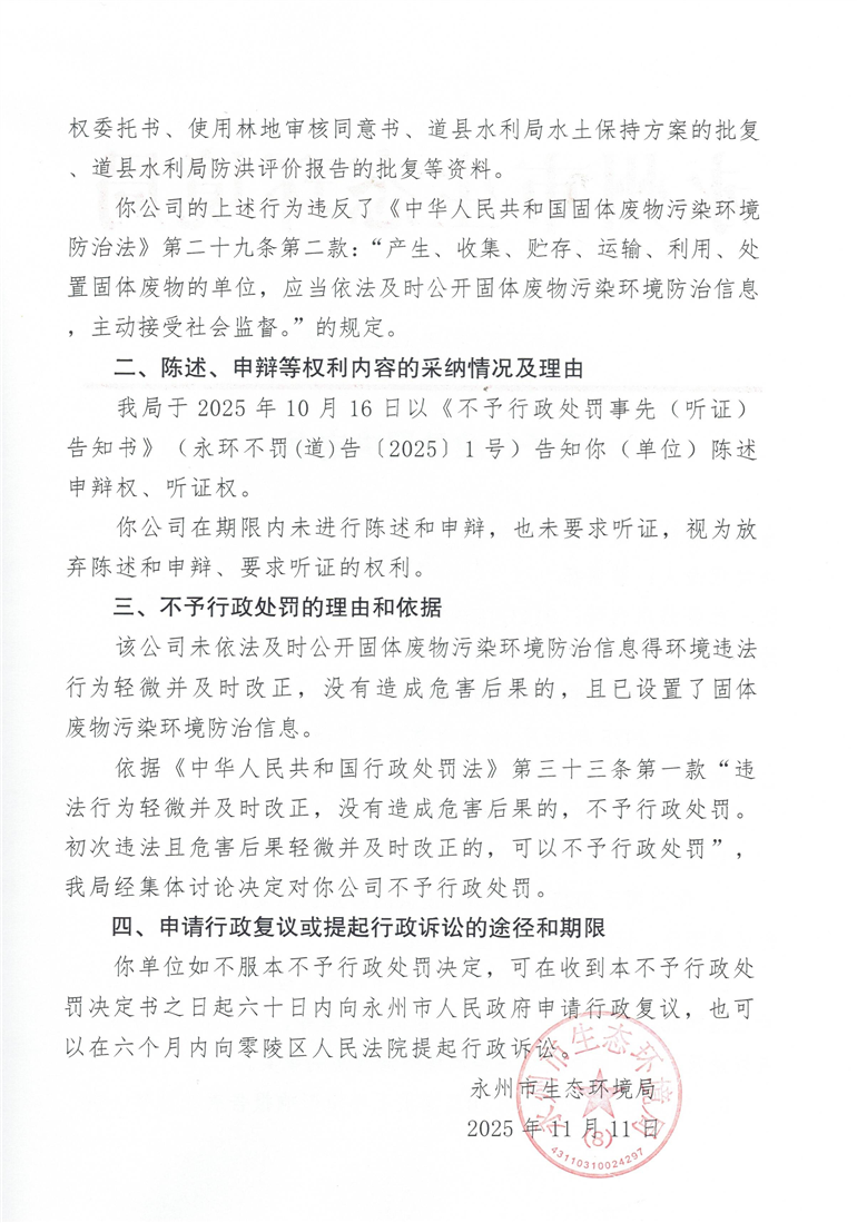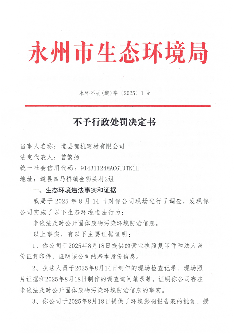 关于对道县锂杭建材有限公司的不予行政处罚决定书