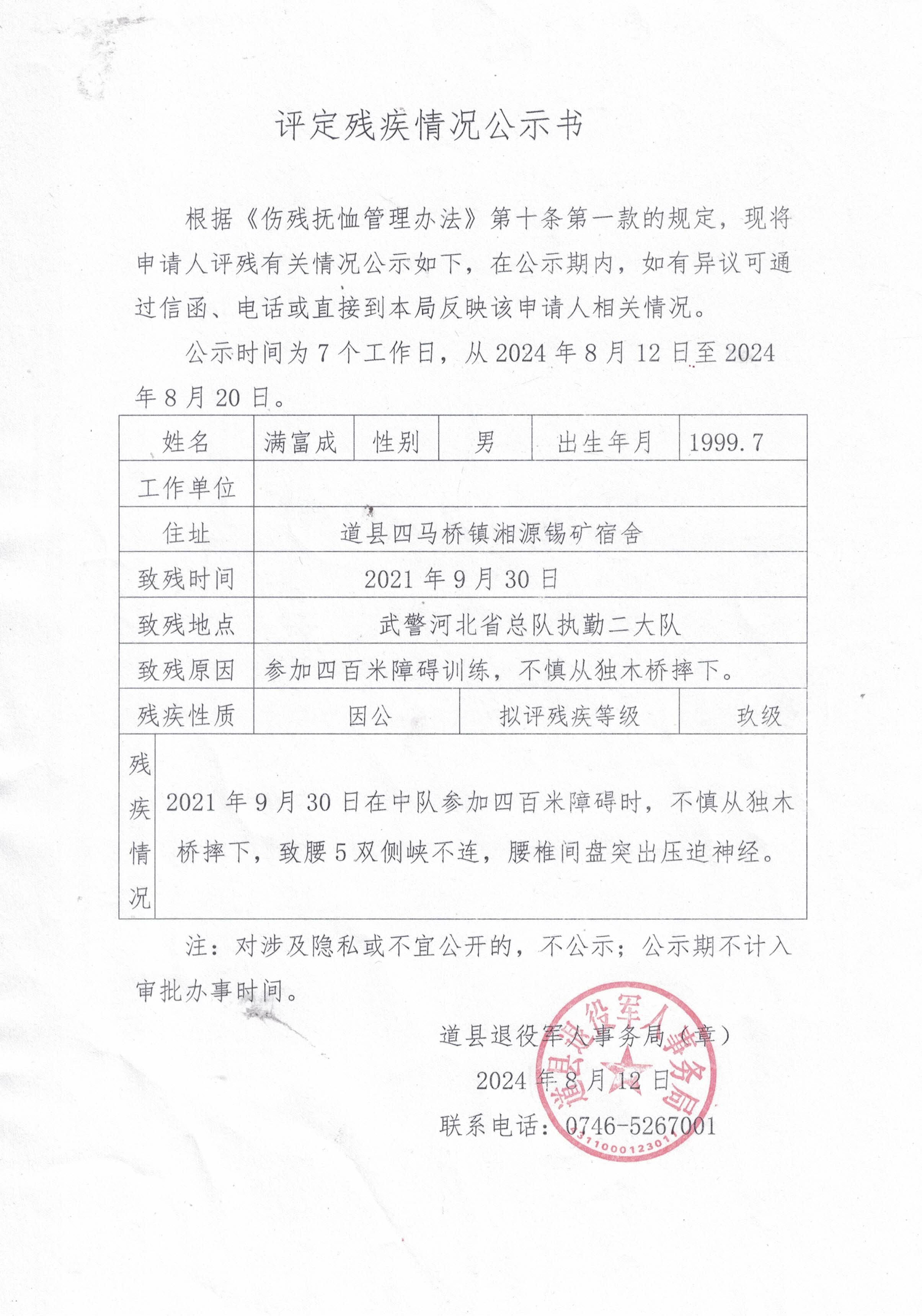 道县退役军人事务局关于满富成同志评定伤残等级公示情况的报告