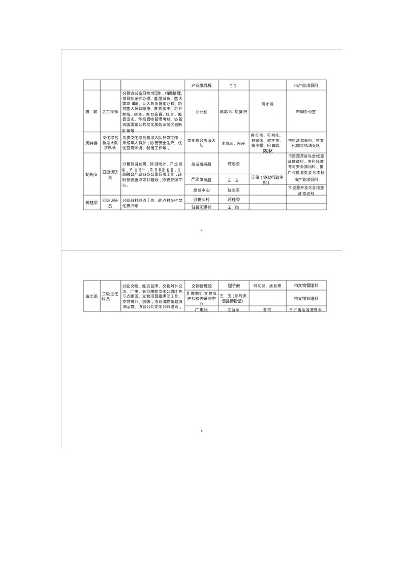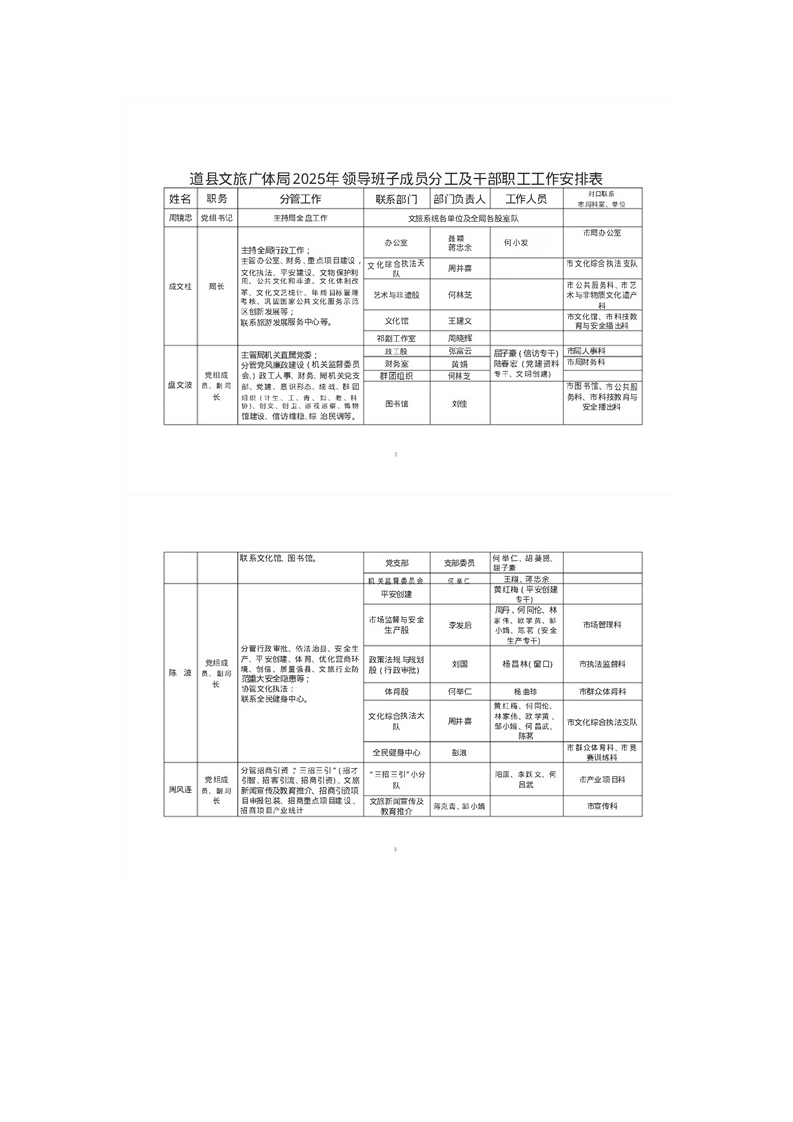 道县文旅广体局领导班子成员分工及干部职工工作安排表