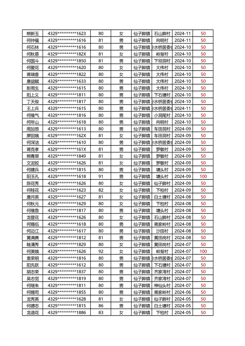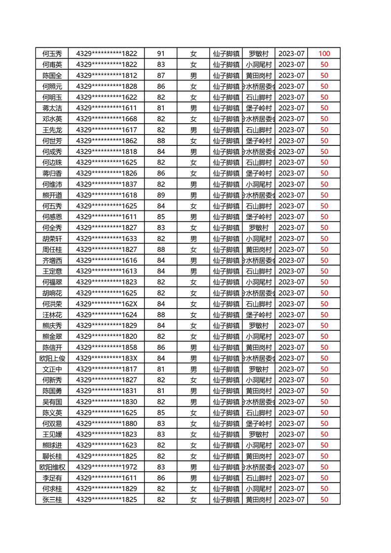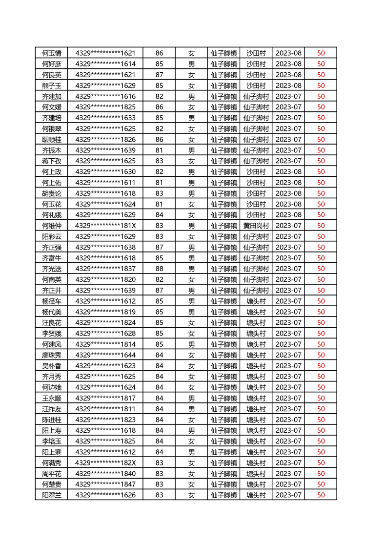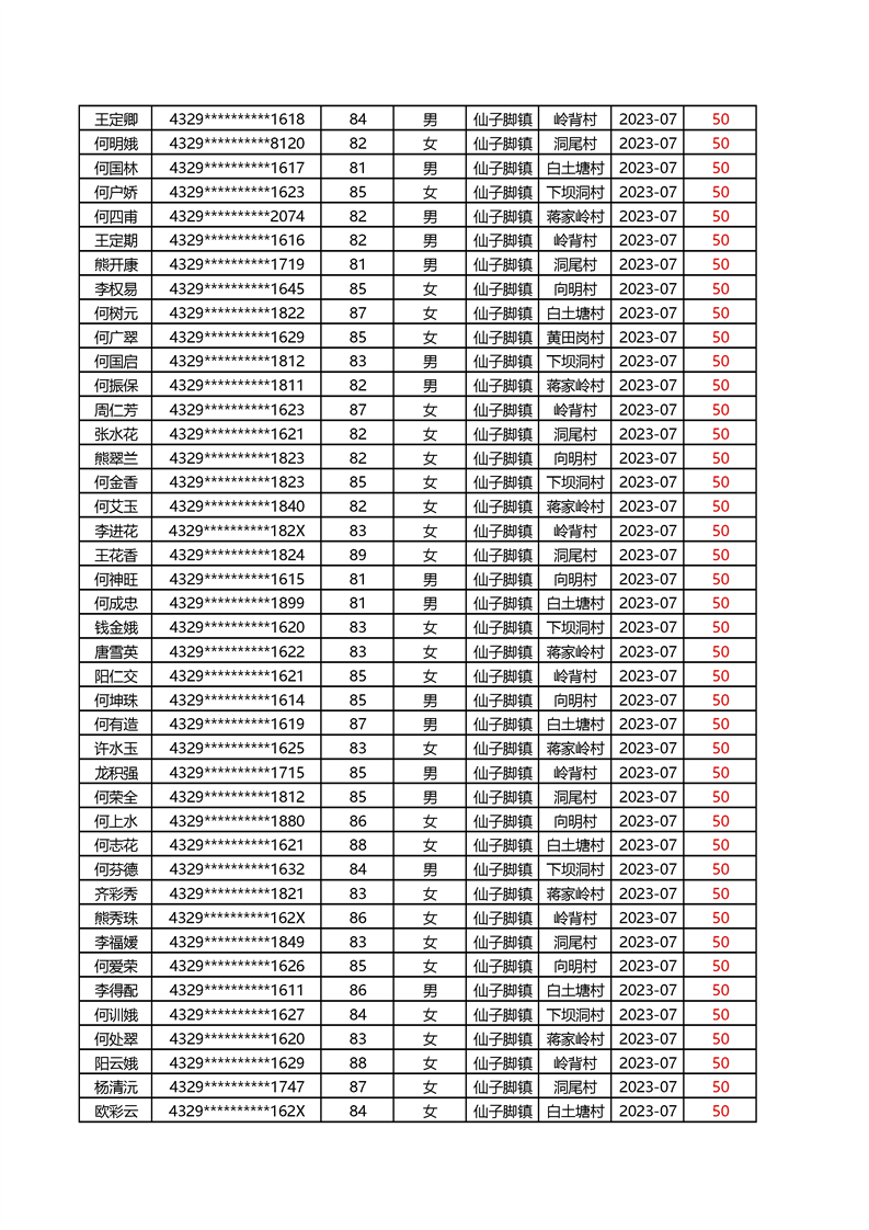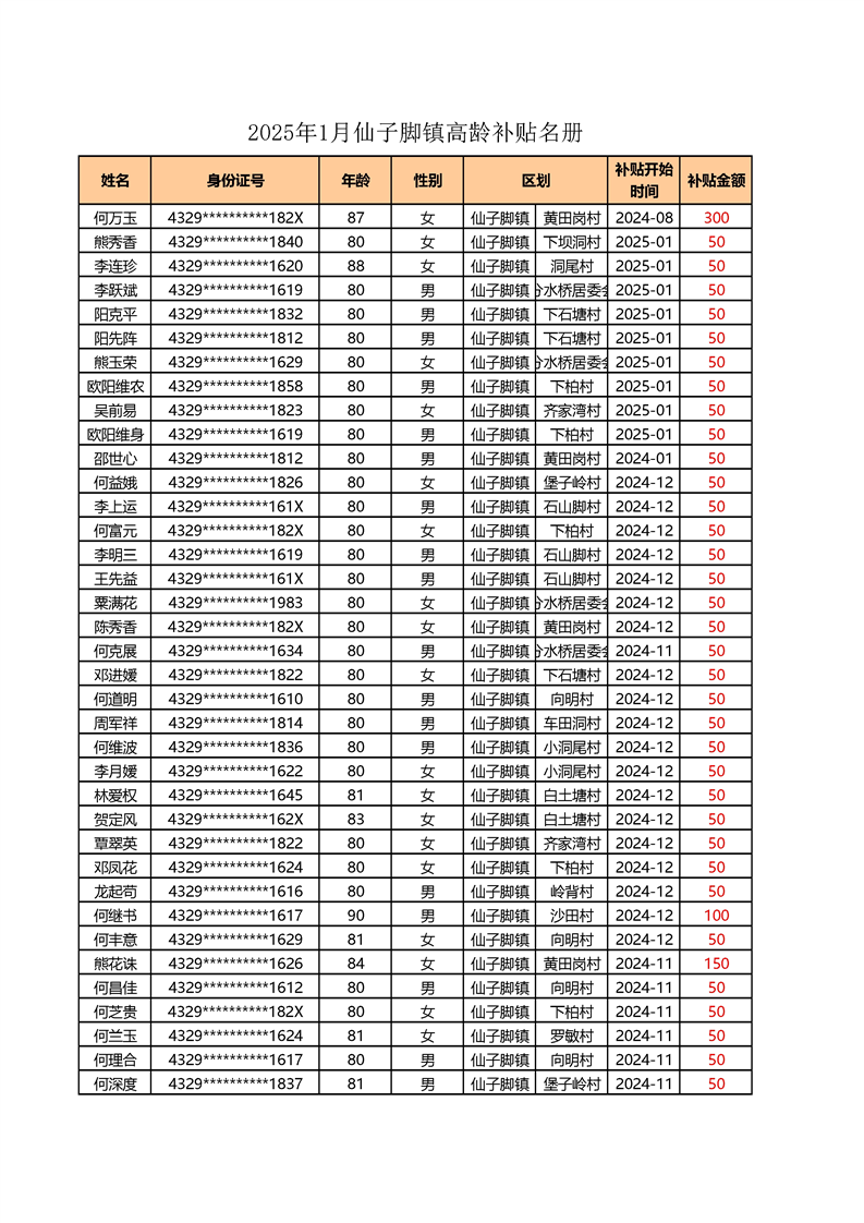 2025年1月仙子脚镇高龄补贴名册