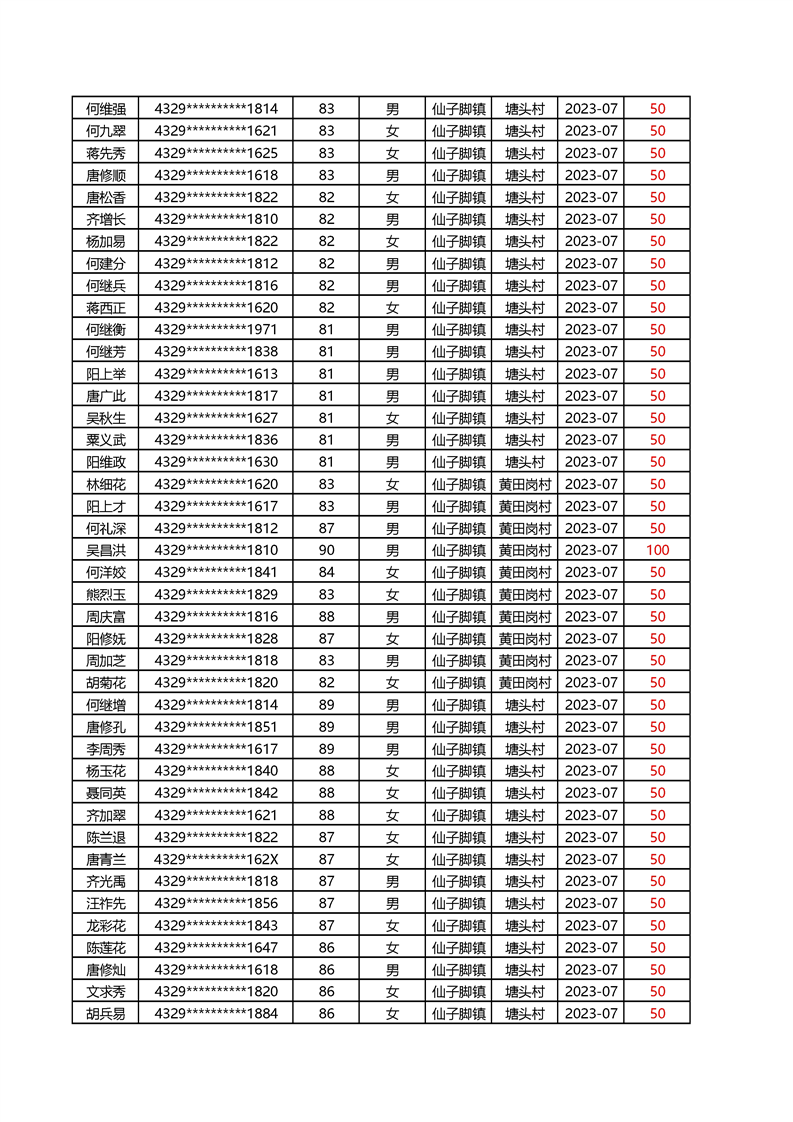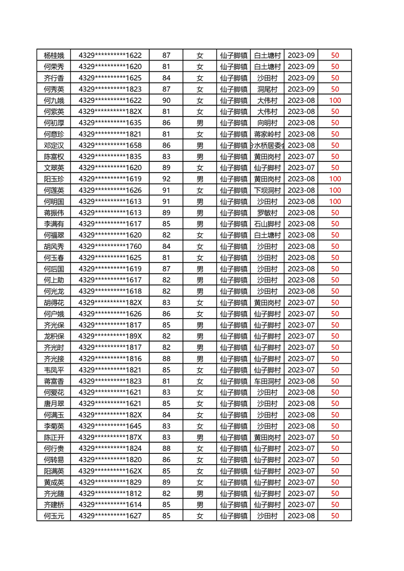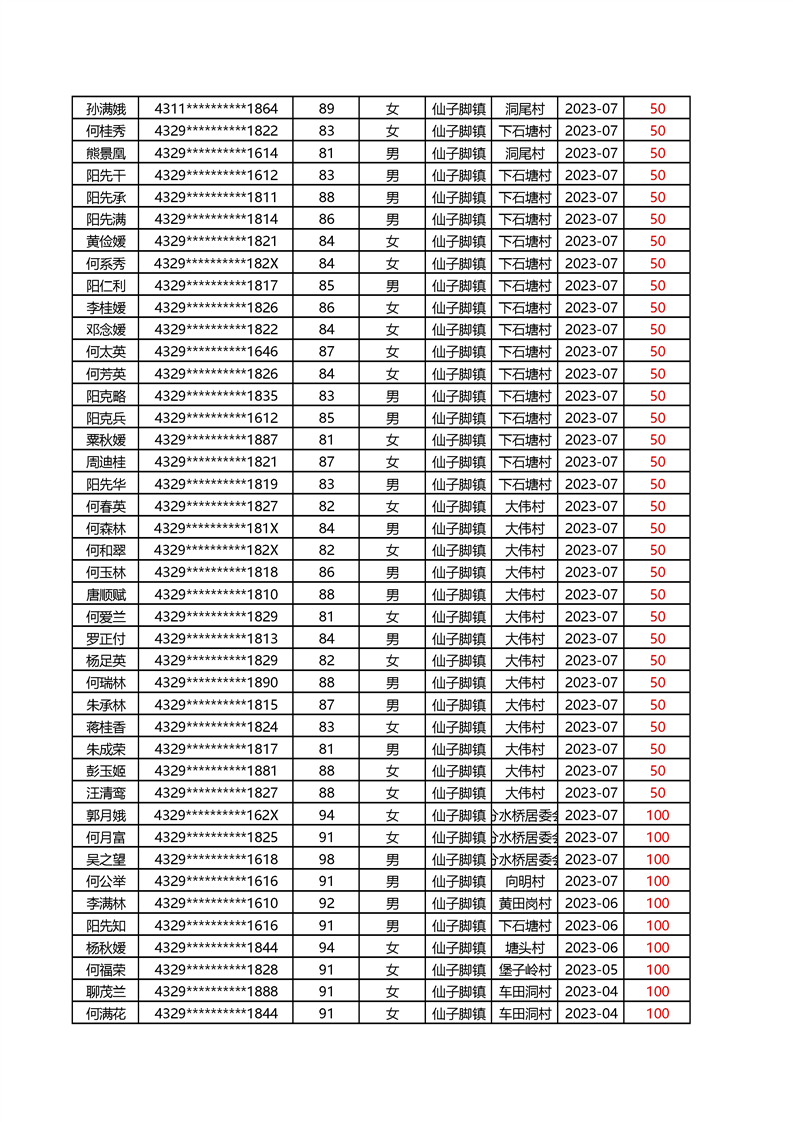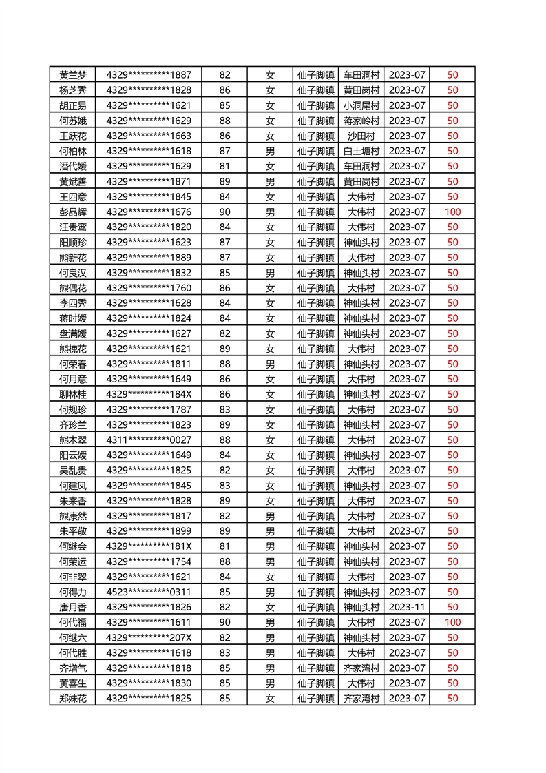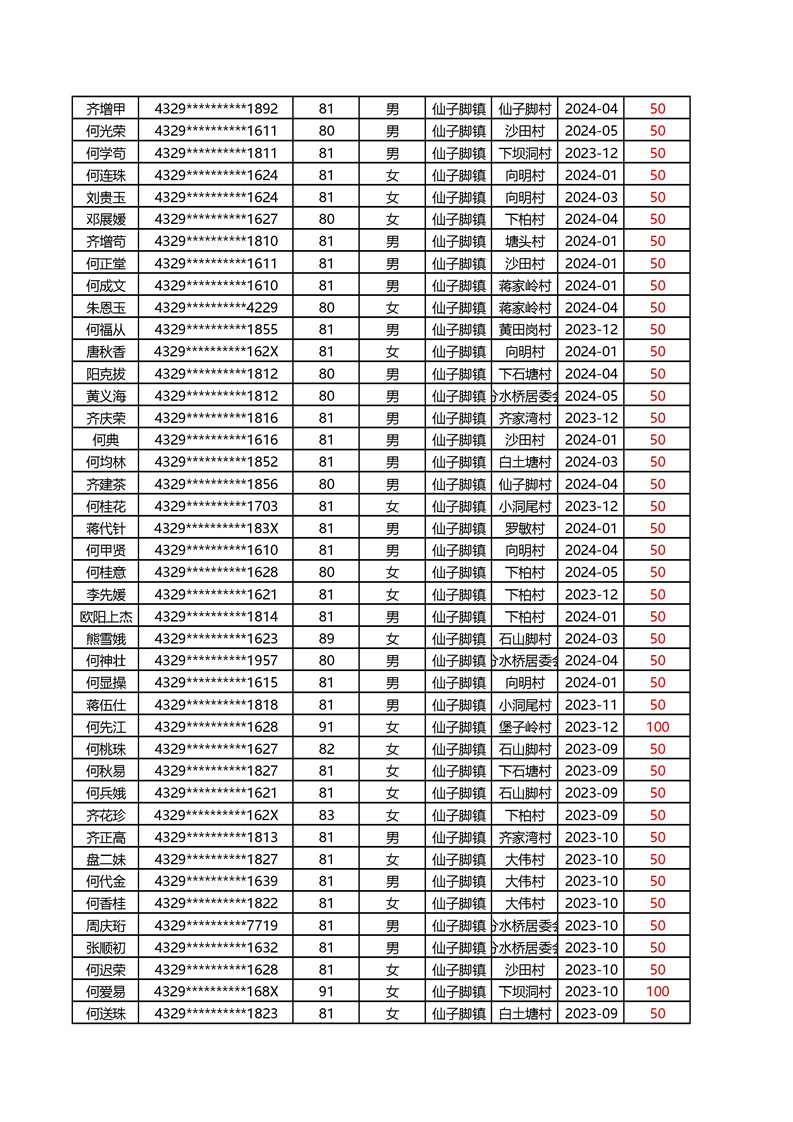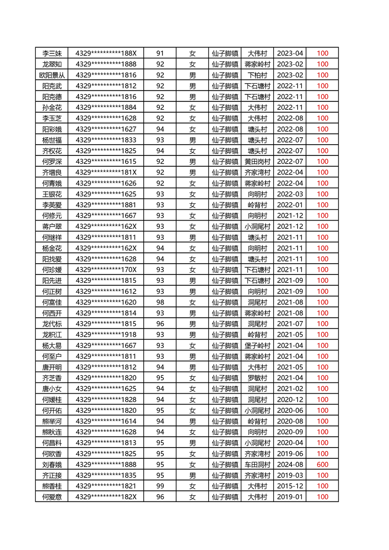 2025年1月仙子脚镇高龄补贴名册