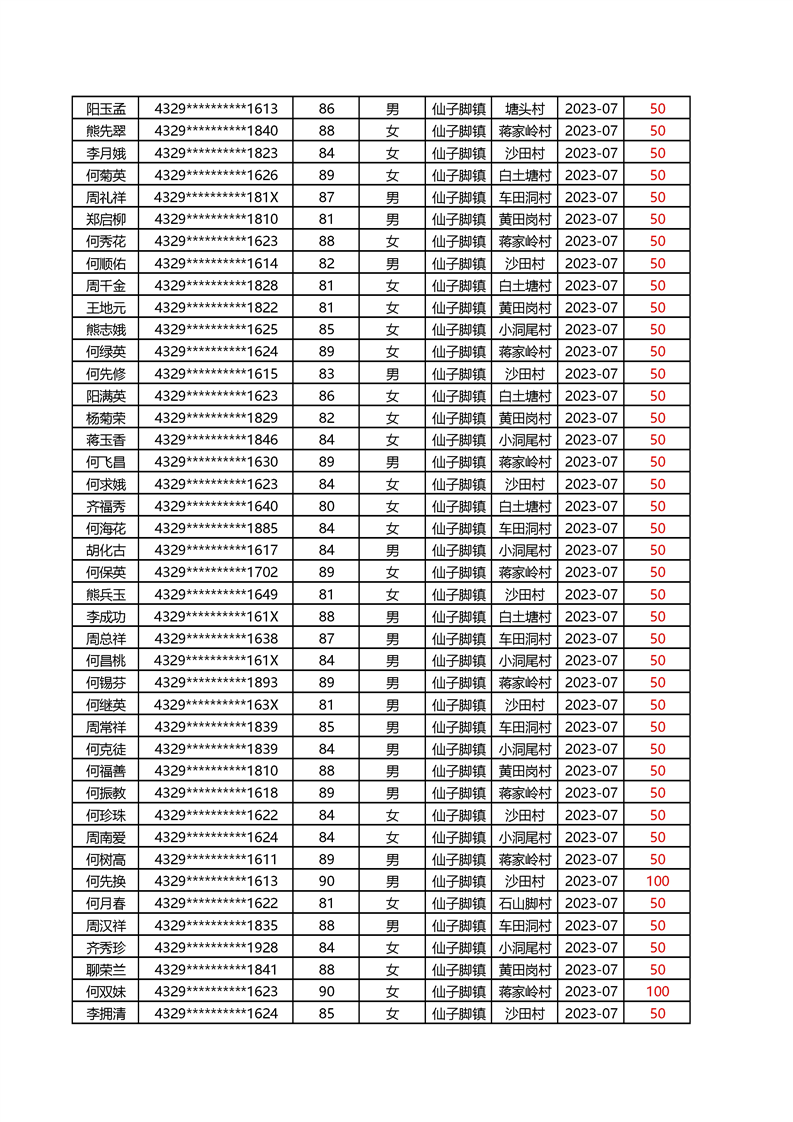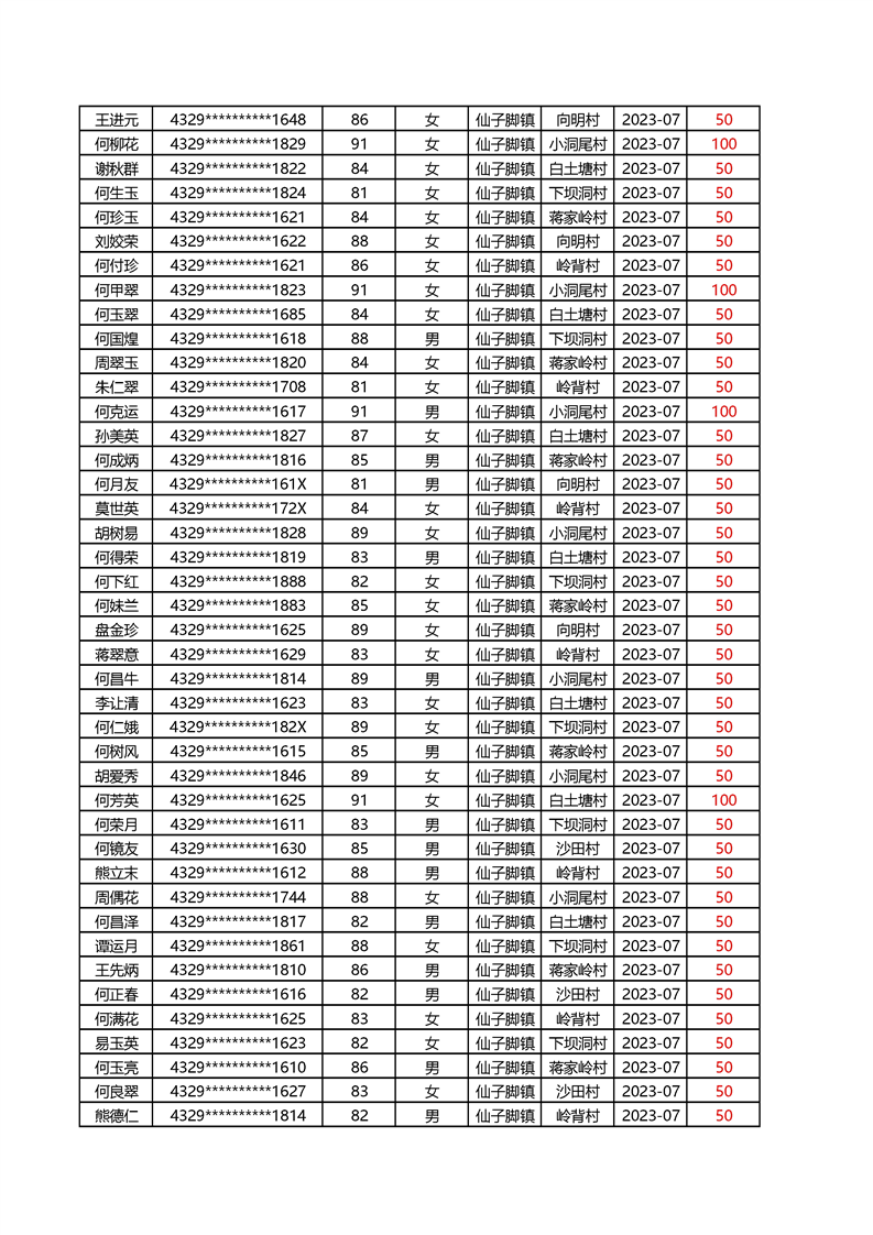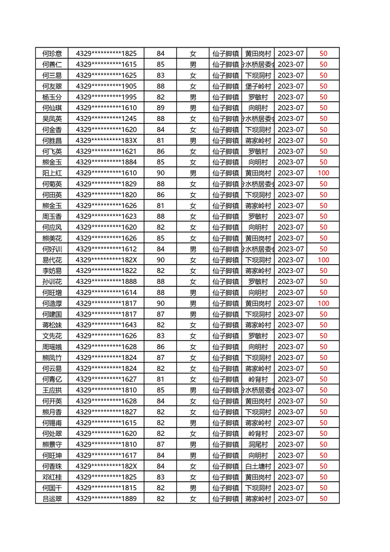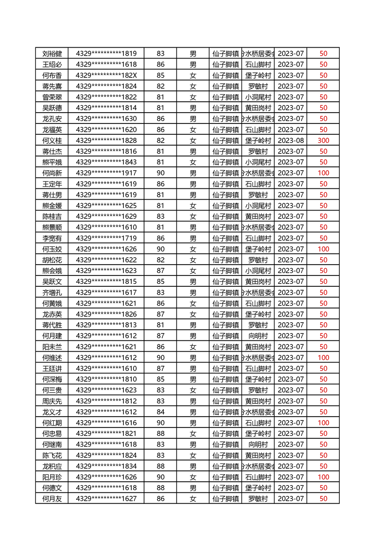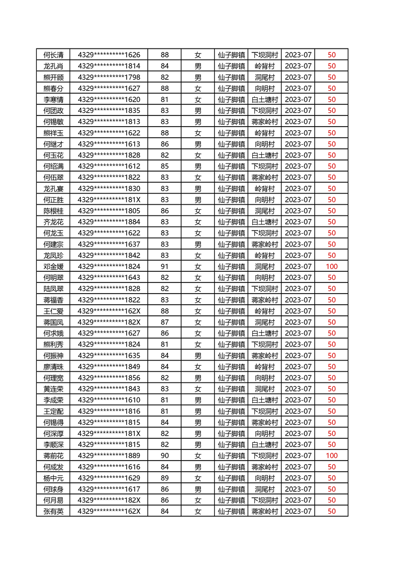 2025年1月仙子脚镇高龄补贴名册