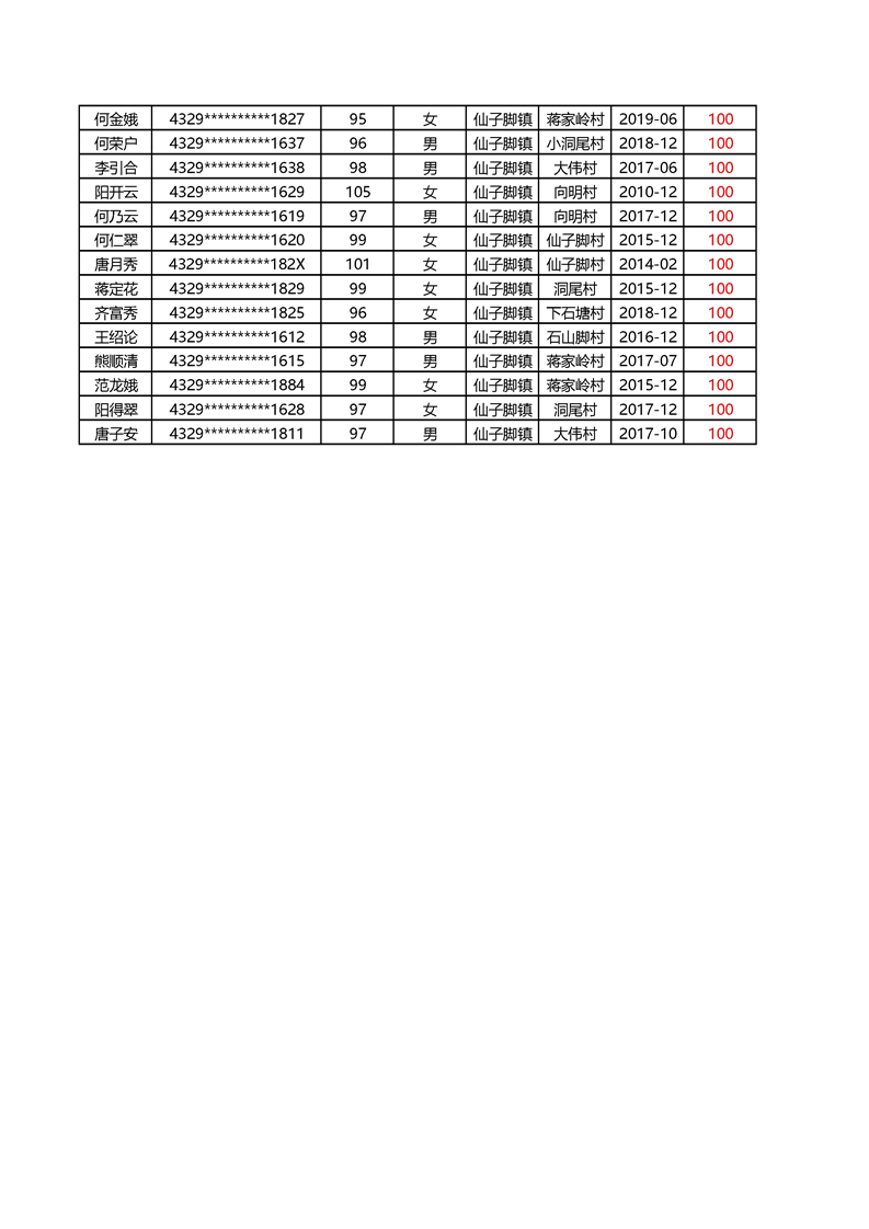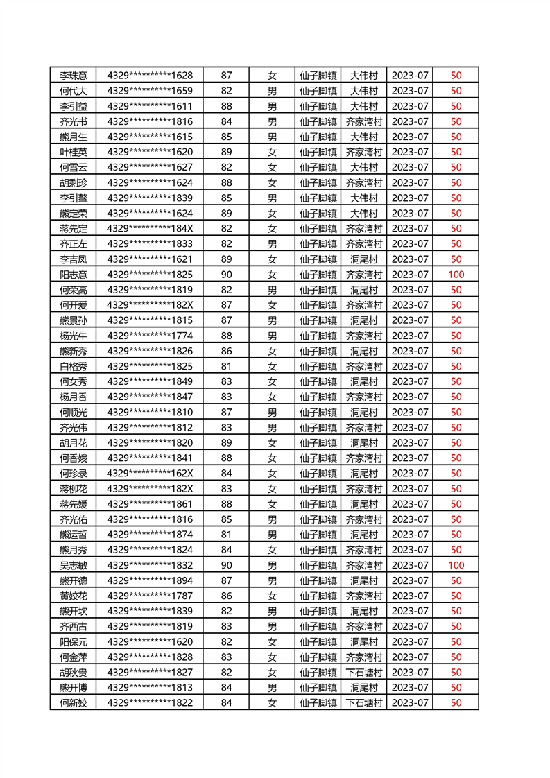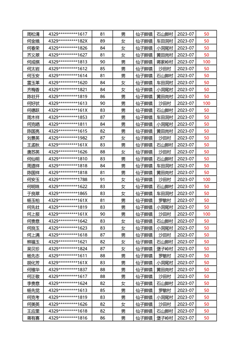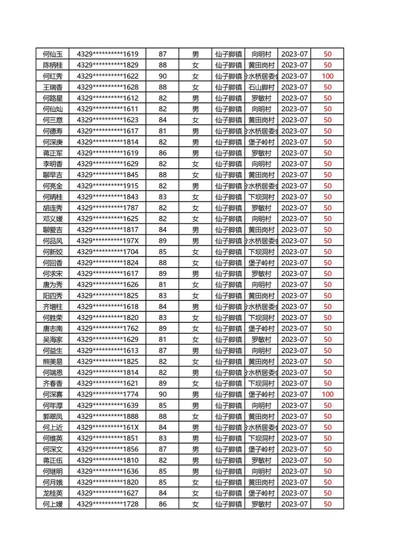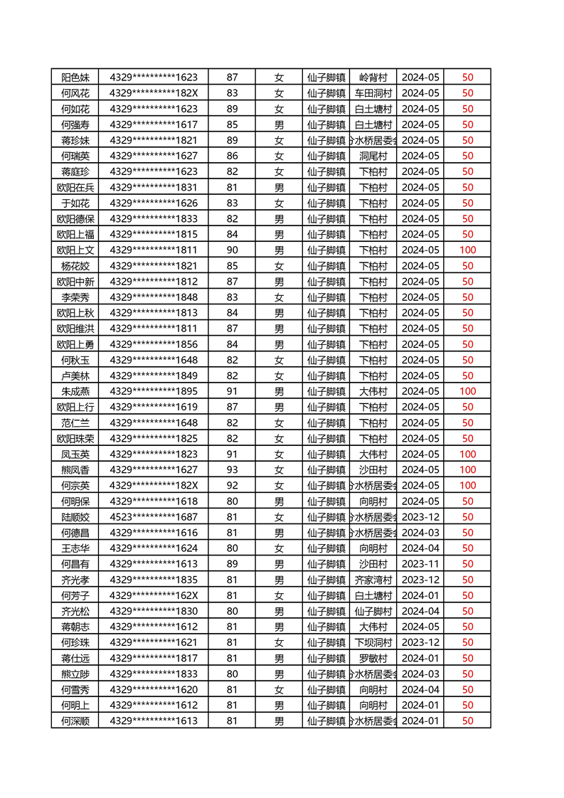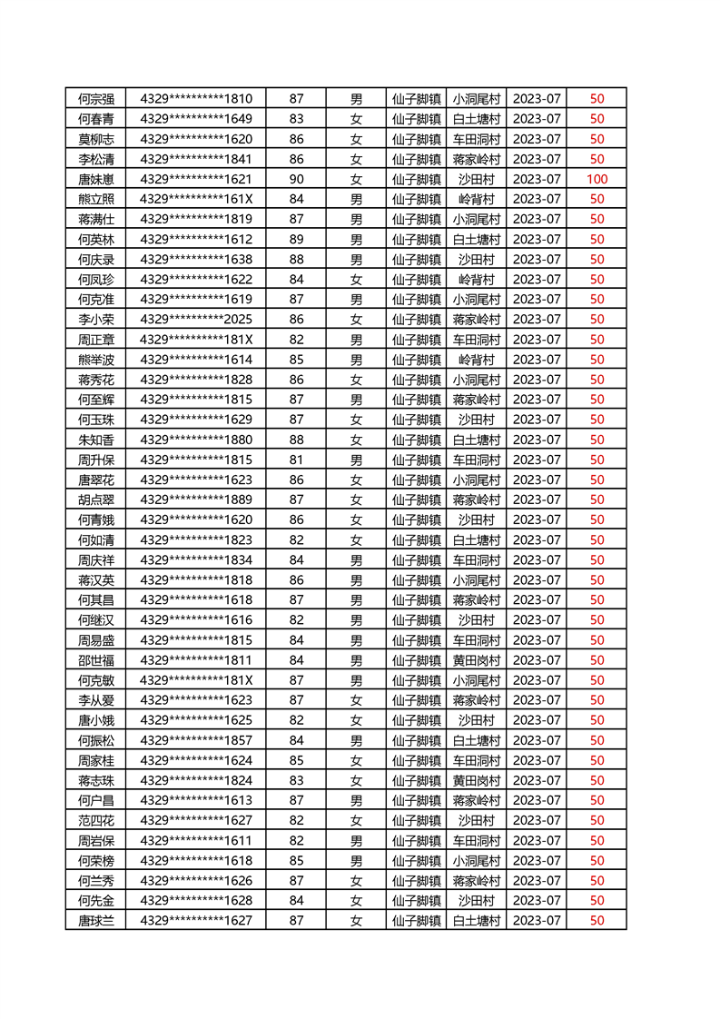 2025年1月仙子脚镇高龄补贴名册