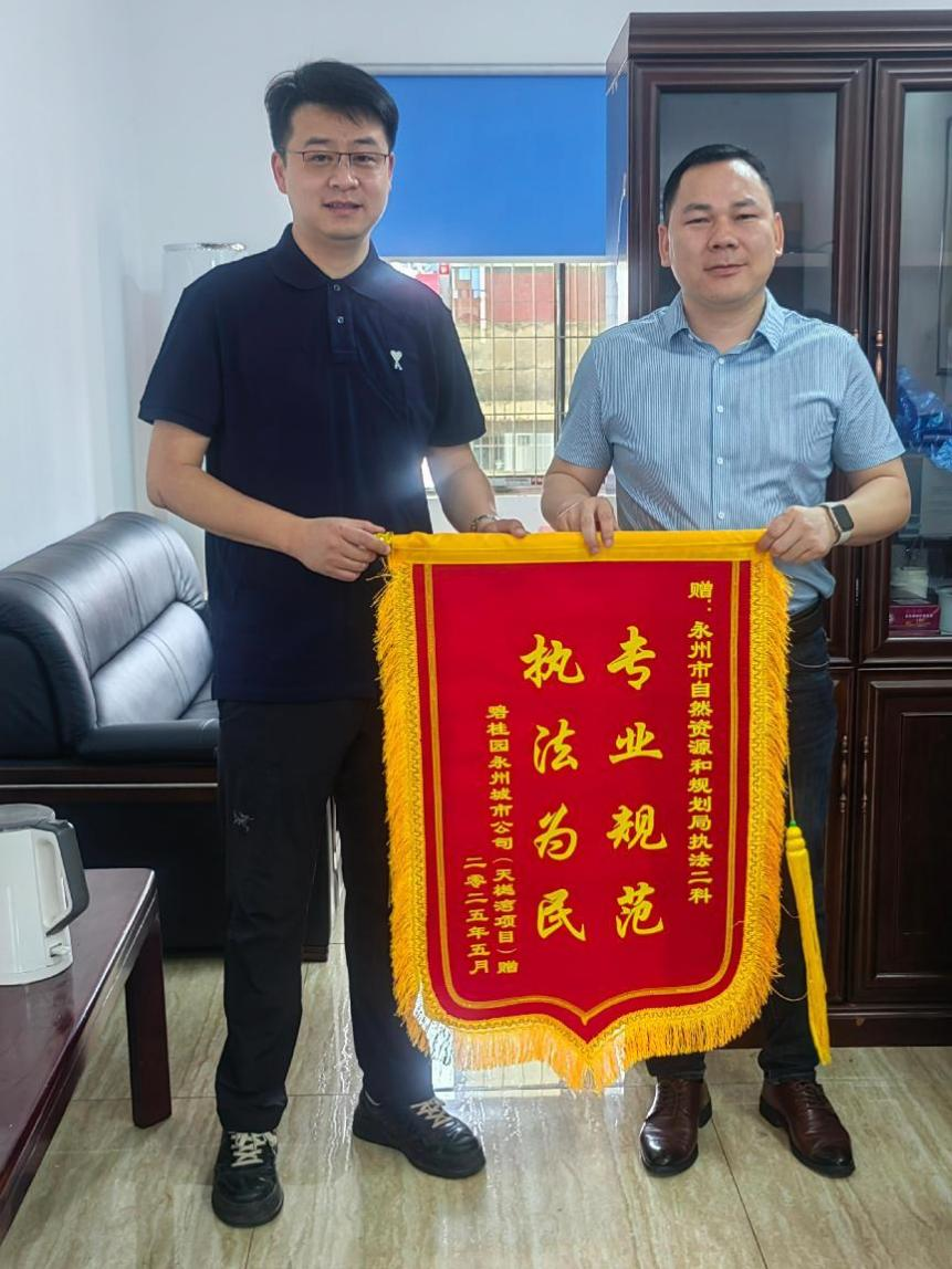 5月30日,碧桂园永州城市公司(天樾湾项目)将一面印有“执法为民 专业规范”的锦旗送至永州市自然资源和规划局执法二科,对我局高效解决项目办证难题、保障业主权益表示诚挚感谢。