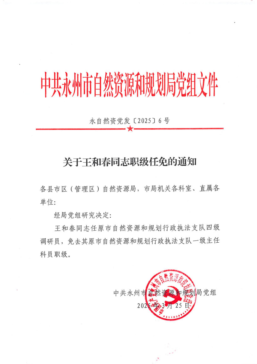 关于王和春同志职级任免的通知
