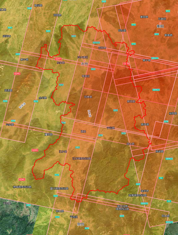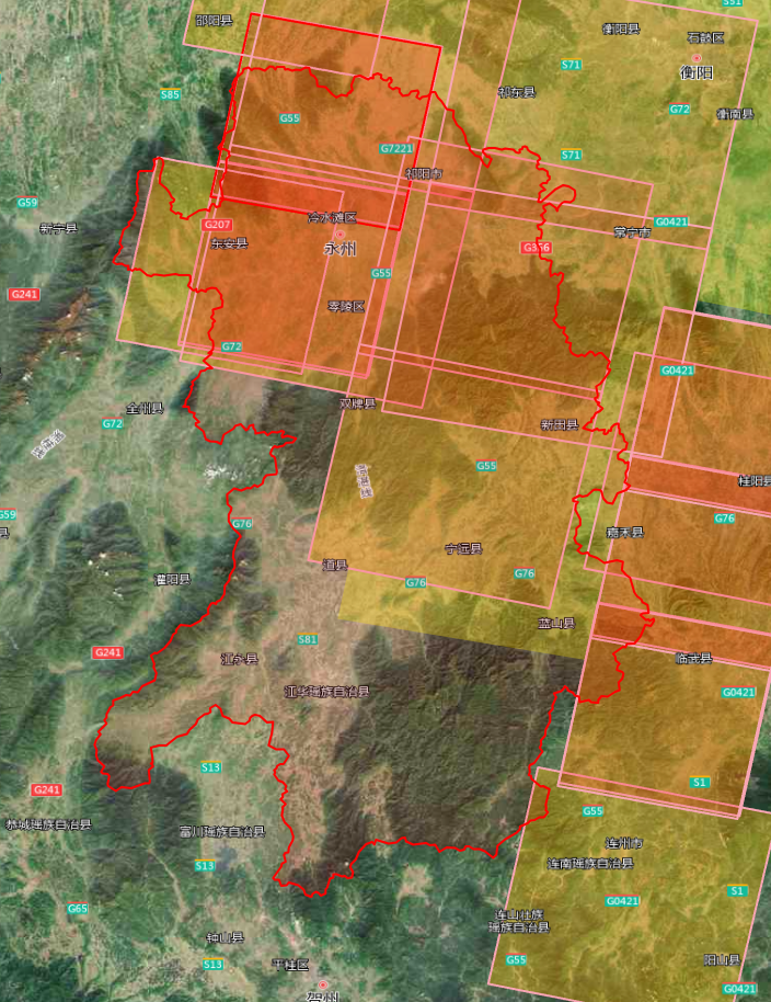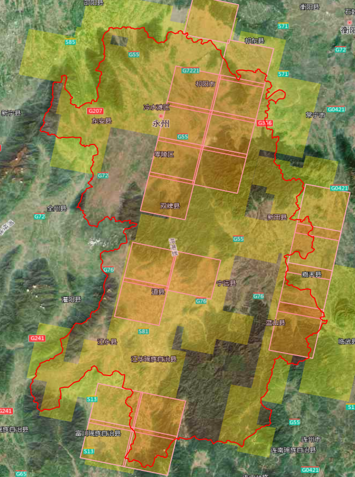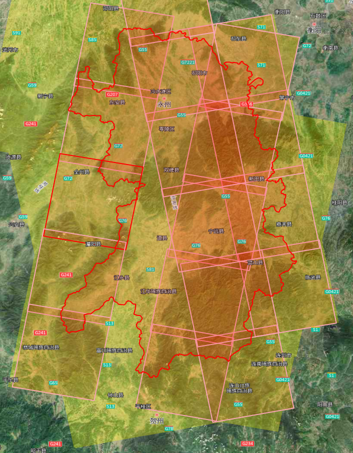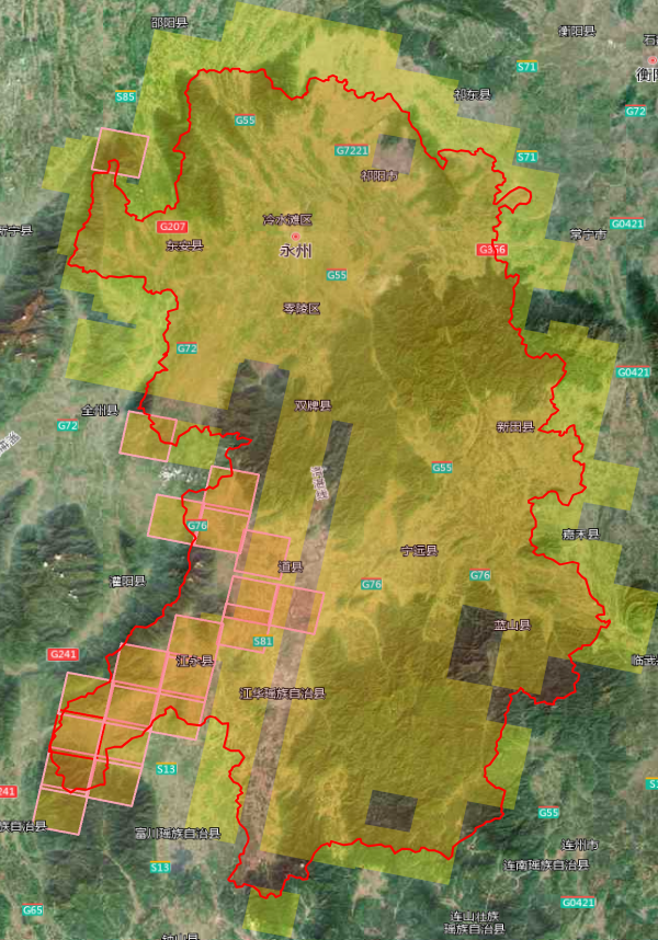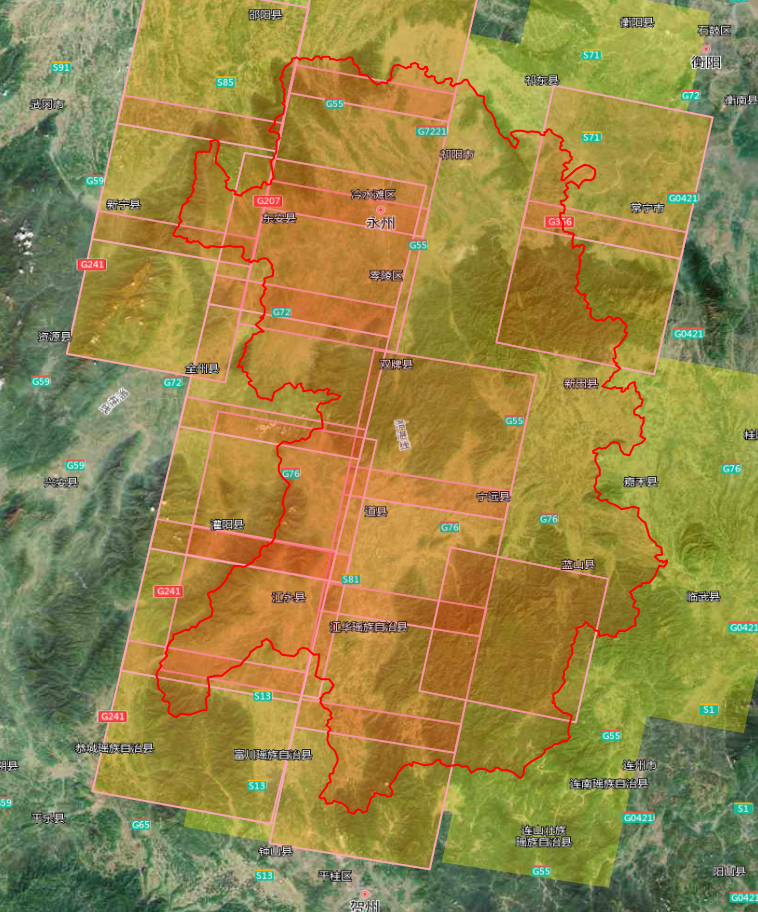 2m分辨率影像共23景,覆盖东安县、祁阳市、冷水滩区、宁远县、新田县全部区域;道县、蓝山县、零陵区、双牌县部分区域: