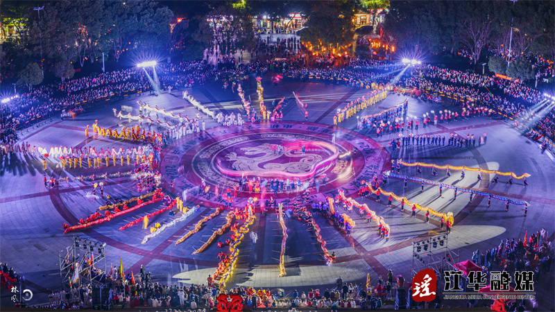 晚上八点,33支龙狮队伍齐聚图腾园广场,江华县委书记段贵建宣布2024“龙腾瑶都·电机之光”万人龙狮灯会开幕。