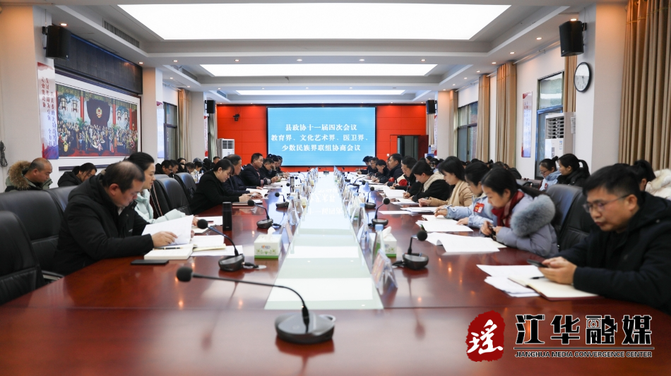 2月25日,江华县委书记段贵建、该县县领导义洁、万汝青、何永亮、熊丽丽、冯云参加江华政协十一届四次会议教育界、文化艺术界、医卫界、少数民族界联组协商会议,与委员们一起共商江华发展大计。