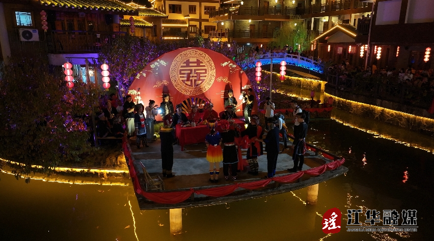 华灯初上,《盘王娶亲》情景剧在瑶都水街隆重上演,各地瑶胞和游客从四面八方涌来。不多时,现场已是人山人海。随着锣鼓声响起,表演正式开始,演员们通过精彩生动的表演,将坐歌堂、迎亲、拜礼、敬茶、抛绣球等环节演绎得栩栩如生,吸引了大量的游客近距离感受瑶族婚俗的魅力,让他们更加了解瑶族的历史和文化。