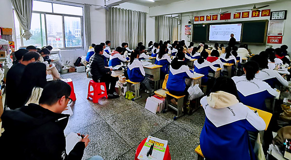 在视导交流反馈会上,该校高三挂点领导、副校长胡明清对年级教育教学工作进行汇报。视导组分学科反馈了视导过程中的意见。