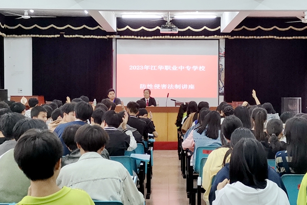 近日,为提高青少年的法治意识和自我保护能力,减少和预防青少年违法犯罪,江华瑶族自治县人民法院刑事庭副庭长兼江华职业中专学校法治副校长冯香萍,在江华职中多媒体会议室为该校师生们带来一堂以“自尊、自爱、自卫筑梦青春”为主题的安全法治教育课。