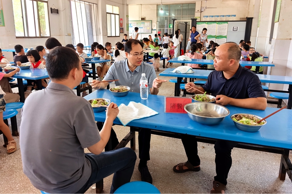 邓述荣一行重点检查了学校食堂后厨操作间、食材储存区、餐具清洗消毒区等关键区域,详细询问食品安全管理制度落实、食品加工规范流程及从业人员健康管理等情况。在与学生共进午餐时,邓述荣亲切询问学生用餐体验,仔细品尝菜品口味,并认真听取学生对餐食质量、种类搭配的意见建议。