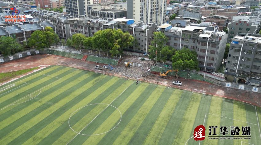 在江华二中,校园提质改造工程正在有条不紊地进行。田径场旧主席台已顺利完成拆除,新建土建工程全面展开。校园通透式围墙翻旧建新工程进展顺利,原有瓷砖已全面铲除,仿古瓷砖铺贴和铁护栏安装工作同步推进。与此同时,学校文化广场建设项目已完成规划设计阶段,正式进入场地平整与基础施工环节。
