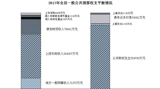 收支平衡情况:2017年,全县完成地方一般预算收入7.13亿元,上级补助收入26.49亿元,债务转贷收入7.87亿元(置换一般债券5.56亿元,新增一般债券2.31亿元),从政府性基金调入0.15亿元,从预算稳定调节基金调入0.11亿元,上年结转收入0.44亿元,可安排使用的收入总量为42.19亿元。完成一般公共预算支出35.48亿元,地方政府债务还本支出5.91亿元,上解上级支出0.11亿元,结转下年支出0.69亿元,支出总计42.19亿元。当年收支平衡。
