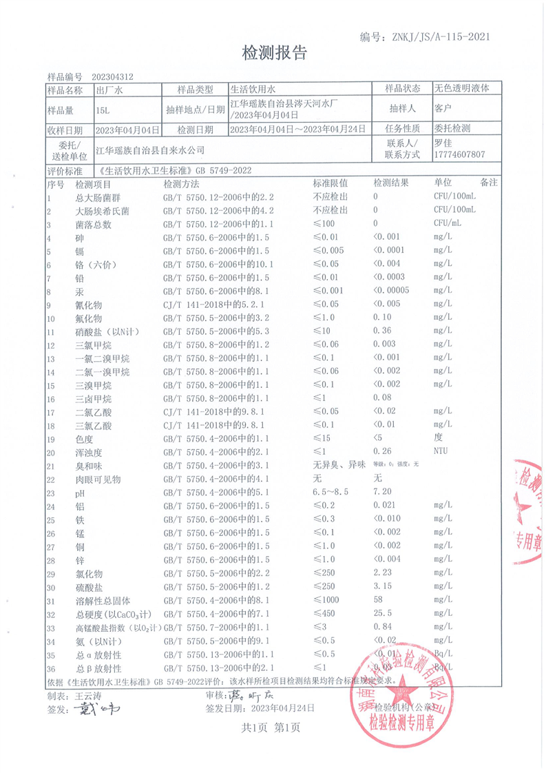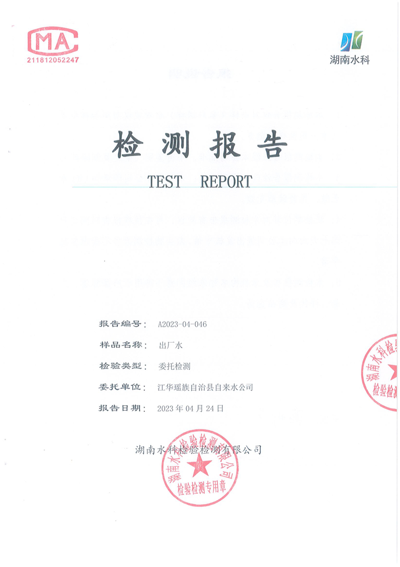 江华瑶族自治县自来水公司2023年4月份水质检测报告