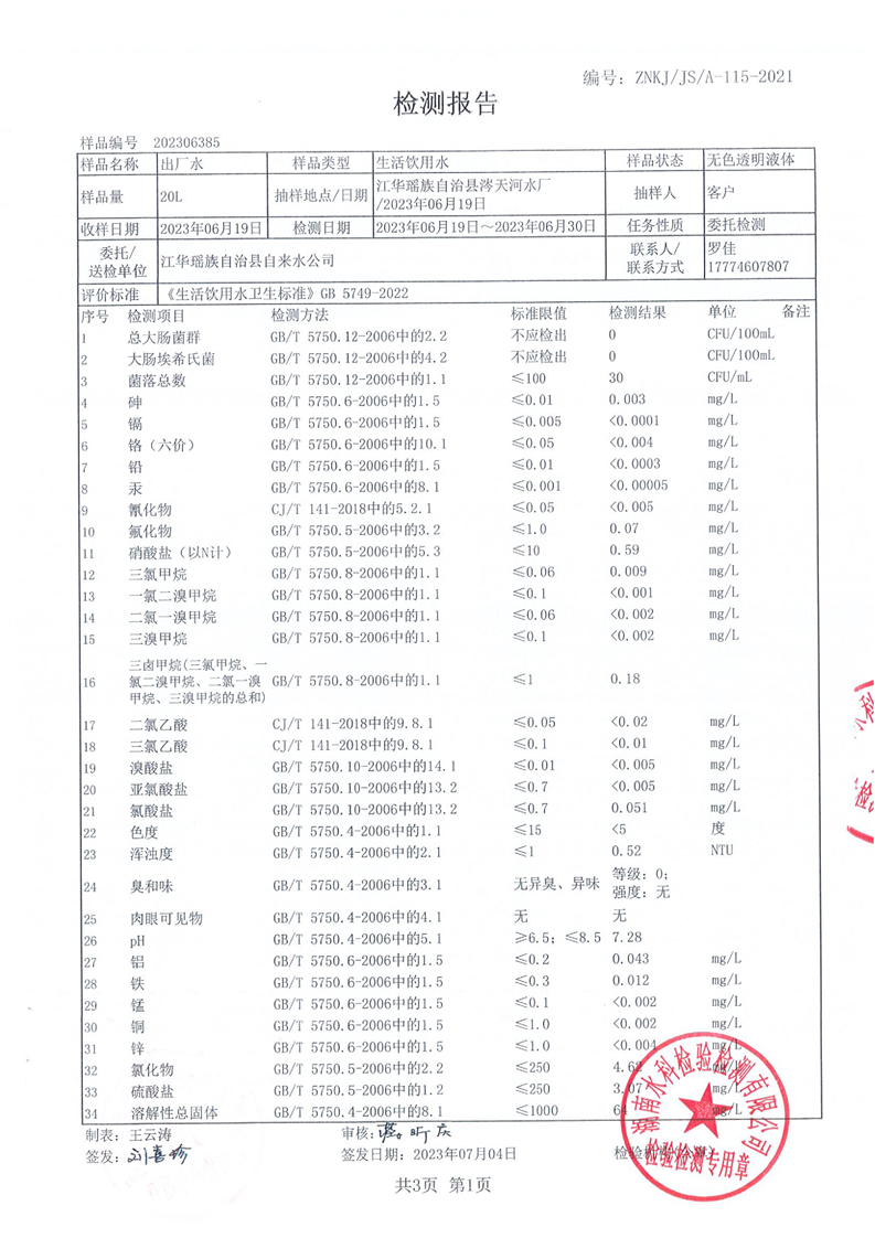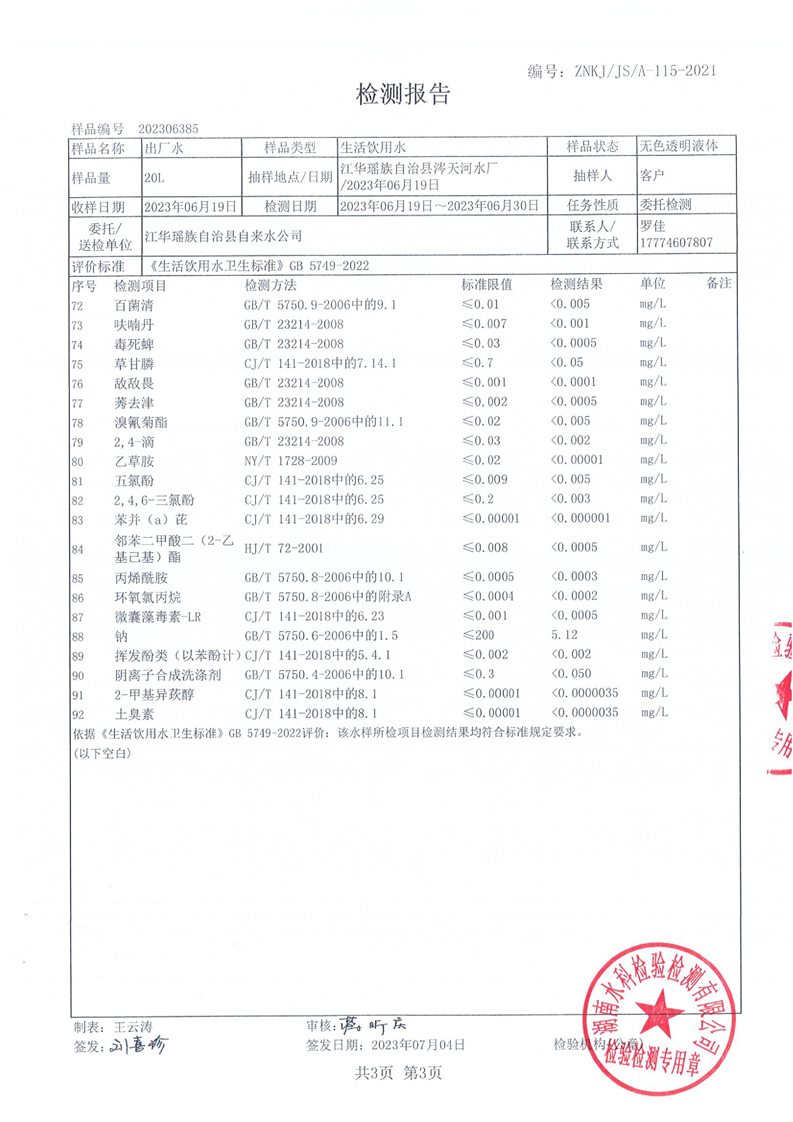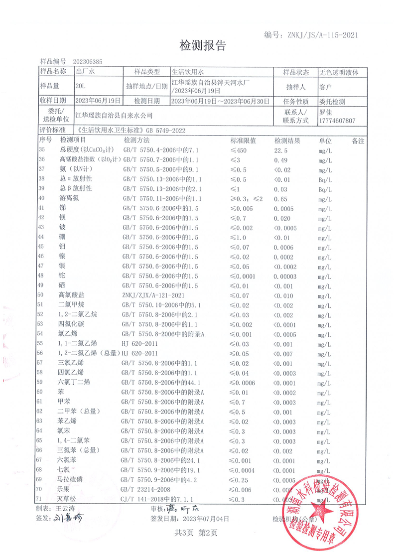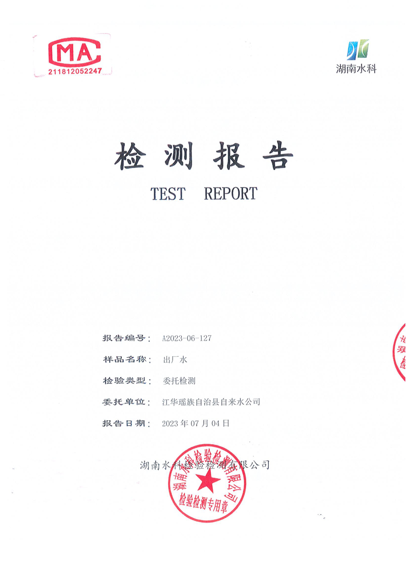 江华瑶族自治县自来水公司2023年6月份水质检测报告