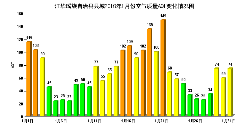 江华瑶族自治县空气自动监测站位于乡镇企业局楼顶,每日24小时实时监测空气中二氧化硫、二氧化氮、PM10、PM2.5、一氧化碳和臭氧浓度。按照(GB 3095-2012)和(HJ663-2013)评价标准,2018年1月应监测31天,实际有效监测30天(1月11日因PM2.5仪器故障导致数据不完整,省站根据规定对当日数据进行了填充,填充后空气质量为良),达标天数为24,其中AQI级别:优12天,良12天,空气质量优良率为77.42%;轻度污染7天(1月1、2、15、16、18、19、21日),超标比例为22.58%,超标污染物为PM2.5。与去年12月份相比空气质量优良率下降了6.45%;与去年同期(2017年1月)相比空气质量优良率上升了12.90%。