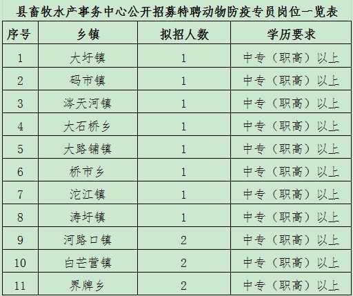 为满足我县动物疫病防控工作需要,按照农业农村部办公厅《关于在农技推广服务特聘计划中设立特聘动物防疫专员的通知》(农办牧〔2020〕17号)和《关于印发特聘动物防疫专员工作方案》(湘农办畜牧〔2020〕62号)文件精神,县畜牧水产事务中心2020年度拟公开招募特聘动物防疫专员14名。现将有关事项公告如下:
