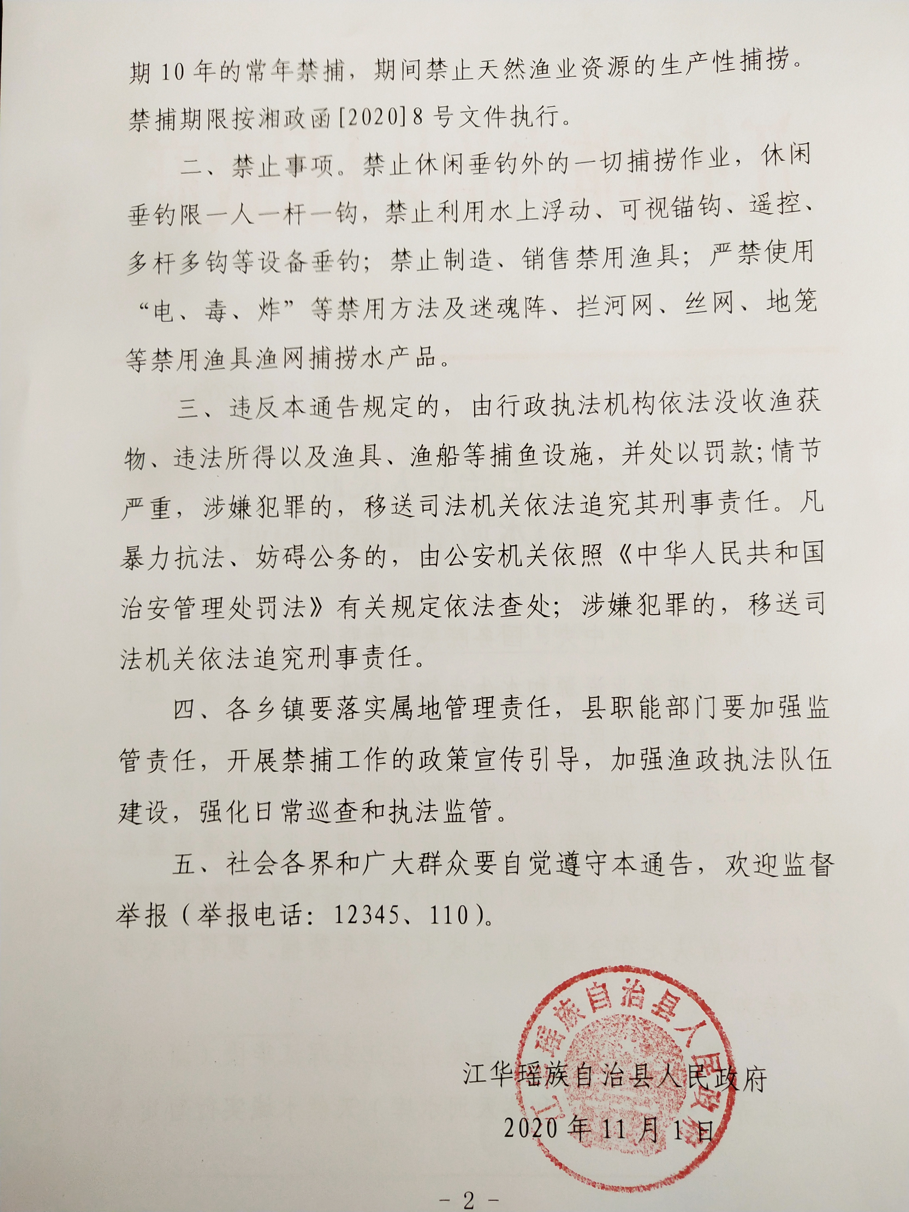 江华瑶族自治县人民政府关于实行重点水域全面禁捕的通告