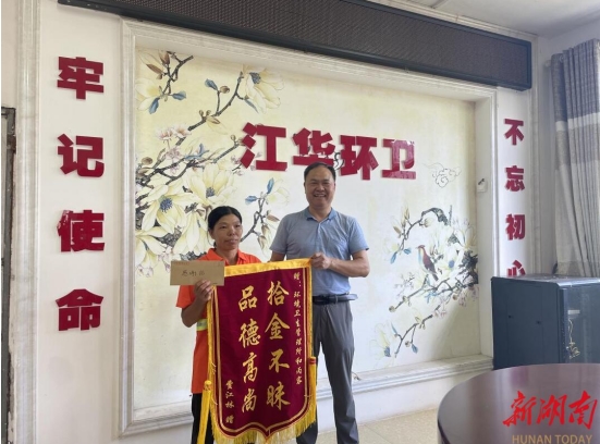 新湖南客户端讯(通讯员 朱健健)“衷心感谢你们,感谢你们的拾金不昧和积极帮助,让我避免了大的损失和麻烦......”2024年8月9日上午,费先生将一面写有“拾金不昧 品德高尚”的锦旗和一封感谢信送到江华瑶族自治县环卫所环卫工人和丙容手中,感谢她拾金不昧帮助找回失物。