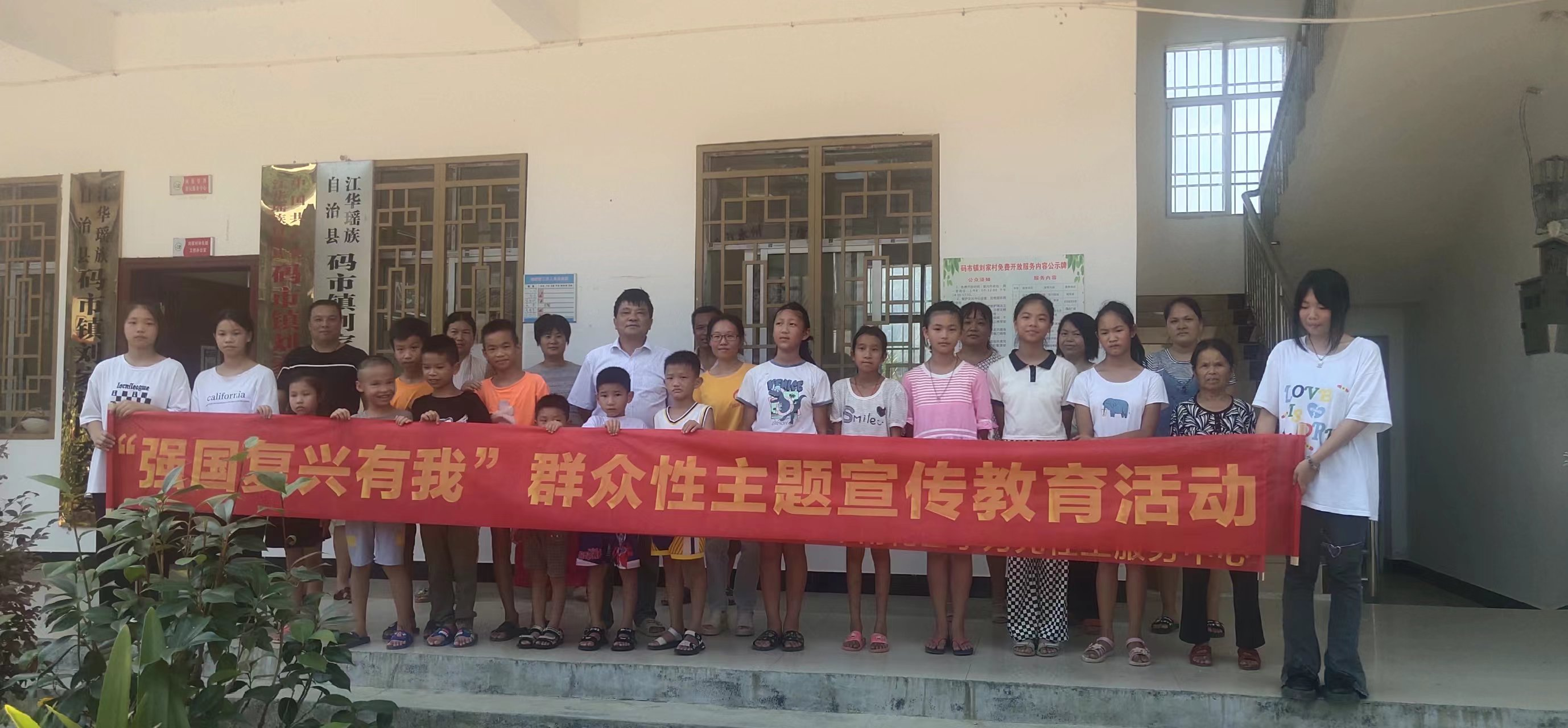 2022年7月28日,县民政局瑶都红社会组织志愿服务队联合码市镇社工站志愿者在码市镇刘家村开展“强国复兴有我”主题宣传教育活动,积极培育和践行社会主义核心价值观。