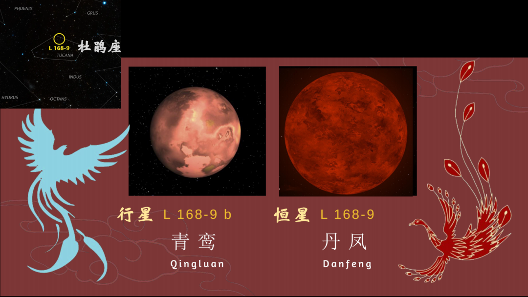 在发布会上,北京天文馆馆长、中国天文学会普及工作委员会主任王晓锋教授为“丹凤(Danfeng)”星和“青鸾(Qingluan)”星的命名牌揭幕,并介绍了这两个充满东方神韵的名称,展望了后续的科学普及工作。母恒星L 168-9是一颗红矮星,被命名为“丹凤”(Danfeng),指红色的凤凰,是中国古代神话传说中象征祥瑞的神鸟。围绕着它快速公转的行星命名为“青鸾”(Qingluan),是古代传说中属于凤凰一类的神鸟,也称作青鸟,它行动迅捷、奔波不息,也是传递爱情的使者。大家熟知的李商隐诗作——“青鸟殷勤为探看”,就留下了它的美名。丹凤与青鸾,这两个名称非常符合这个行星系统的性质,体现了天文学与中国传统文化的有机结合,也会让世界进一步了解中华文明的深厚底蕴。