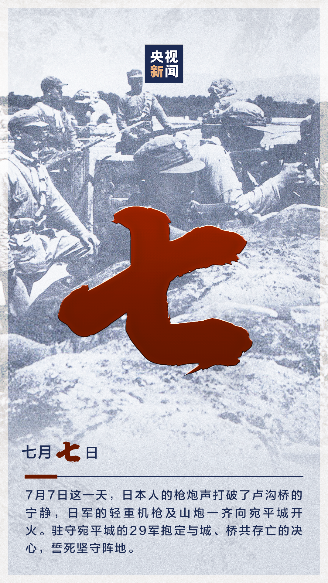 今天(7月7日)是七七事变爆发86周年。86年前的今天,日本侵略者悍然发动全面侵华战争。这是中华民族记忆中凝结血泪的一天,无数中华儿女不顾生死,为保卫河山浴血奋战。先烈的血染山河,才换取了今日和平。