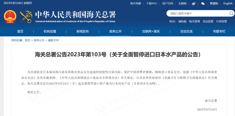 北京时间24日中午12时 (日本当地时间24日13时许) 日方不顾国内外多方强烈反对 正式开始将福岛第一核电站的核污染水 排放至太平洋 据日本东电公司发布的消息 今天的核污染水排放量 预计为200至210吨 每天的排放情况将在次日公布 第一阶段排海将持续17天 合计排放约7800立方米核污染水 福岛第一核电站附近 坚决反对,强烈谴责! 8月24日,日本政府无视国际社会的强烈质疑和反对,单方面强行启动福岛核事故污染水排海,中方对此表示坚决反对和强烈谴责,已向日方提出严正交涉,要求日方停止这一错误行为。 日本福岛核污染水处置是重大的核安全问题,具有跨国界影响,绝不是日本一家的私事。自人类和平利用核能以来,人为向海洋排放核事故污染水没有先例,也没有公认的处置标准。12年前发生的福岛核事故已经造成严重灾难,向海洋释放了大量的放射性物质。日方不应出于一己之私利,给当地民众乃至世界人民造成二次伤害。 日本政府没有证明排海决定的正当合法性,没有证明核污染水净化装置的长期可靠性,没有证明核污染水数据的真实准确性,没有证明排海对海洋环境和人类健康安全无害,没有证明监测方案的完善性和有效性,也没有同利益攸关方充分协商。海洋是全人类的共同财产,强行启动向海洋排放福岛核污染水,属无视国际公共利益的极端自私和不负责任之举。日方所作所为是将风险转嫁给全世界,将伤痛延续给人类的子孙后代,成为生态环境破坏者和全球海洋污染者,侵犯各国人民健康权、发展权和环境权,违背自身道义责任和国际法义务。日方将核污染水一排了之,同时也将自己置于国际被告席,必将长期受到国际社会谴责。 中国政府一贯坚持人民至上,将采取一切必要措施,维护食品安全和中国人民的身体健康。 海关总署: 8月24日,海关总署发布公告称,为全面防范日本福岛核污染水排海对食品安全造成的放射性污染风险,保护中国消费者健康,确保进口食品安全,依据《中华人民共和国食品安全法》及其实施条例、《中华人民共和国进出口食品安全管理办法》有关规定,以及世界贸易组织《实施卫生与植物卫生措施协定》有关规定,海关总署决定自2023年8月24日(含)起全面暂停进口原产地为日本的水产品(含食用水生动物)。 海关总署进出口食品安全局负责人就日本福岛核污染水排海回答记者提问。 该负责人表示,日本政府无视国际社会的强烈质疑和反对,于8月24日单方面强行启动福岛核污染水排海。中国海关高度关注日方此举对日本输华食品农产品带来的放射性污染风险。为防范受到放射性污染的日本食品输华,保护人民群众生命健康,海关总署持续开展对日本食品放射性污染风险的评估,在严格确保安全的基础上,对从日本进口食品采取了强化监管措施。 依据我国法律法规相关规定,以及世界贸易组织《实施卫生与植物卫生措施协定》相关规定,海关总署决定对原产地为日本的水产品采取紧急措施,自2023年8月24日(含)起全面暂停进口原产地为日本的水产品(含食用水生动物)。海关总署将持续关注日本核污染水排海情况,视情动态调整有关监管措施,防范核污染水排海对我国民健康、食品安全带来的风险。 生态环境部: 将持续加强海洋辐射环境监测 8月24日,生态环境部(国家核安全局)相关负责人就日本启动福岛核污染水排海答记者问。 相关负责人表示,日本政府强行启动福岛核污染水排海,将一己私利凌驾于全人类长远福祉之上,极其自私和不负责任。我们敦促日方倾听国际社会声音,切实以科学、安全、透明的方式处置核污染水,接受严格国际监督。 相关负责人指出,生态环境部高度重视日本福岛核污染水排海问题。2021年、2022年先后组织开展了我国管辖海域海洋辐射环境监测,摸清了目前相关海域海洋辐射环境的本底情况。监测结果表明,我国管辖海域海水和海洋生物中人工放射性核素活度浓度未见异常,总体处于历年涨落范围内。当前,生态环境部按照监控重点区域、覆盖管辖海域、掌握关键通道的思路,正在组织开展2023年度我国管辖海域海洋辐射环境监测。后续生态环境部将持续加强有关监测工作,及时跟踪研判福岛核污染水排海对我海洋辐射环境可能的影响,切实维护我国家利益和人民健康。 核污染水240天 8月22日,日本东京电力公司公布了向海洋排放核污染水的详细步骤。 按计划,排放前将在处理过的水中加入大量海水,如果确认浓度降低到预想的水平,将在17天内排放第一批共7800吨核污染水。2023年度预计排放约3.12万吨,氚总量为5兆贝克勒尔,约为东电年计划排放量上限(22兆贝克勒尔)的两成。 从2011年3月11日海啸引发地震,使得日本福岛第一核电站发生爆炸,到如今已过去12年。事发之后,为了冷却核反应堆,福岛第一核电站的运营方东京电力公司需要持续注水为反应堆降温,加上地下水和雨水的渗入,形成大量核污染水。 早在2021年,清华大学深圳国际研究生院海洋工程研究院张建民院士、胡振中副教授团队从宏观和微观两种不同的角度分别建立了海洋尺度下放射性物质的扩散模型,并实现了福岛核污水排放计划的长期模拟。 福岛核污水排海后氚的宏观扩散模拟结果 其中,宏观模拟结果表明,核污水在排放后240天就会到达我国沿岸海域,1200天后将到达北美沿岸并覆盖几乎整个北太平洋。 德国海洋科学研究对核污染水
