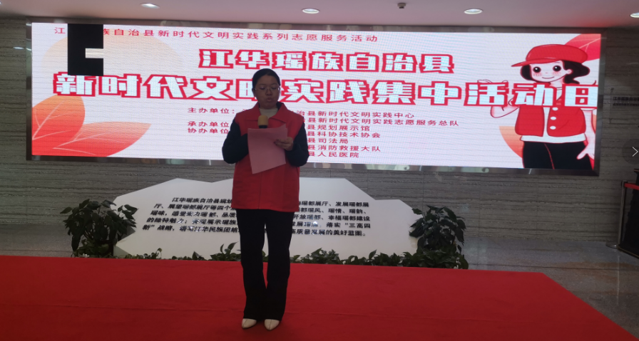 活动启动仪式由江华职业中专潘婧作志愿服务宣讲,县委宣传部常务副部长谢春介绍文明实践集中活动日,宣布集中活动日开始。本次活动日开展活动的种类主要包括社会主义核心价值观主题宣讲暨知识问答、科学普及、法律服务、医疗健身志愿服务活动。