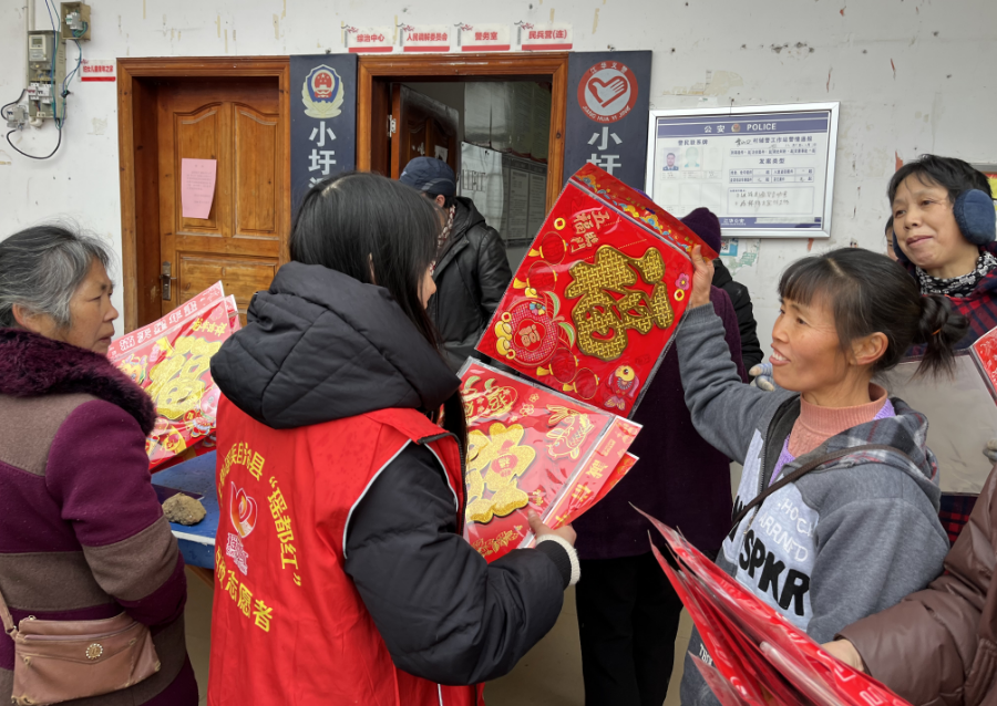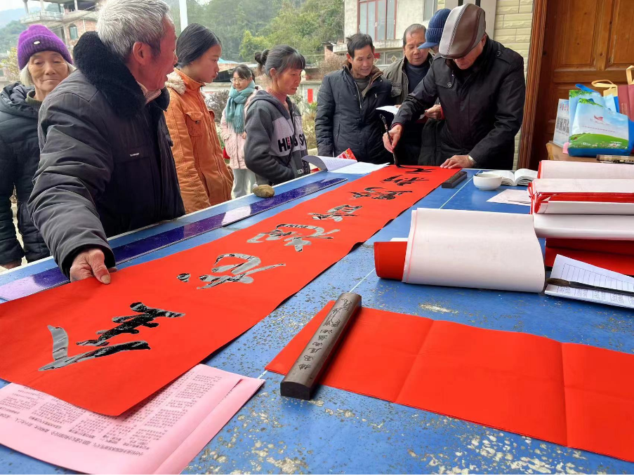 1月26日,县科协驻村工作队联合县书法家协会、小圩壮族乡新时代文明实践中心、青山口村村委会在村里的篮球场组织开展了送科技文化下基层暨迎春送福文明实践活动。此次活动旨在传播科学知识,提高村民的科学素养,同时为村民们送上新年的祝福。县书法家协会的书法爱好者们现场挥毫泼墨,为村民们撰写对联。一副副寓意吉祥、祝福满满的对联在他们的笔下诞生,充满了浓厚的节日氛围。村民们拿到对联后,喜悦之情溢于言表,纷纷感谢县科协和县书法家协会为他们送上的新春祝福。
