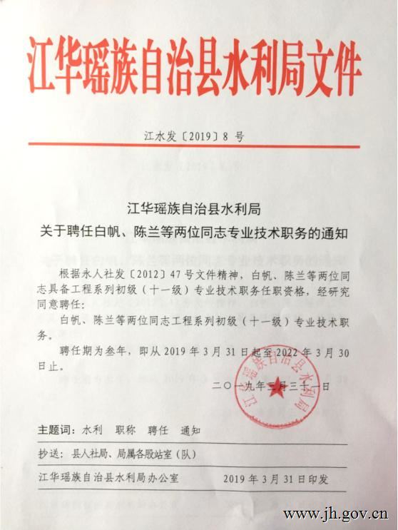 关于聘请白帆、陈兰等两位同志专业技术职务的通知