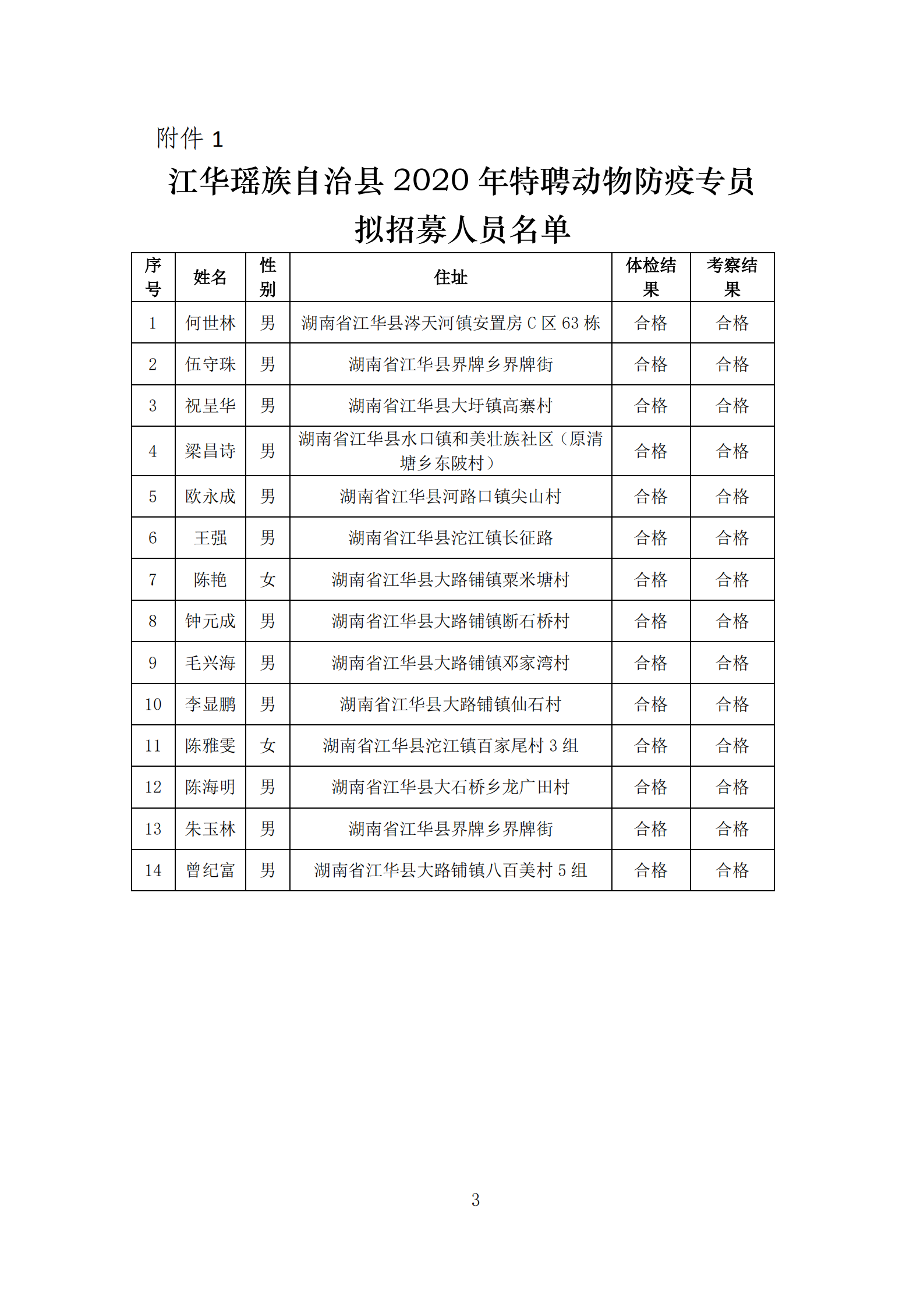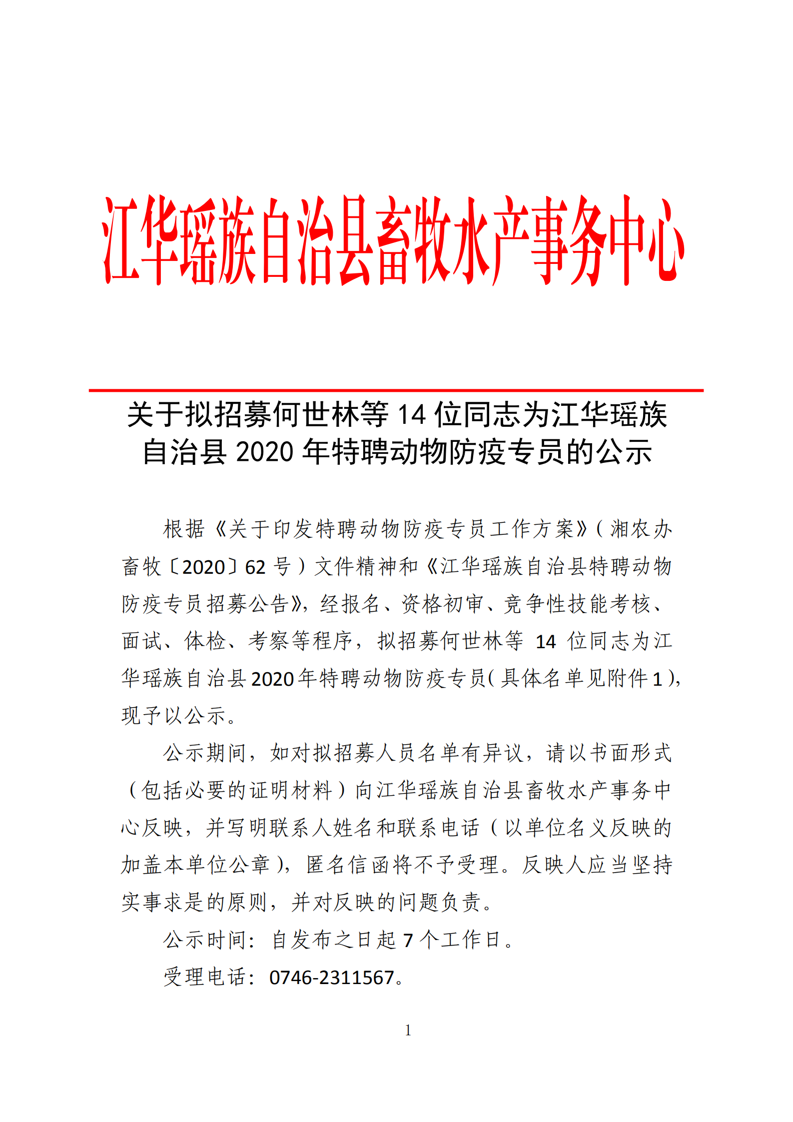 关于拟招募何世林等14位同志为江华瑶族自治县2020年特聘动物防疫专员的公示