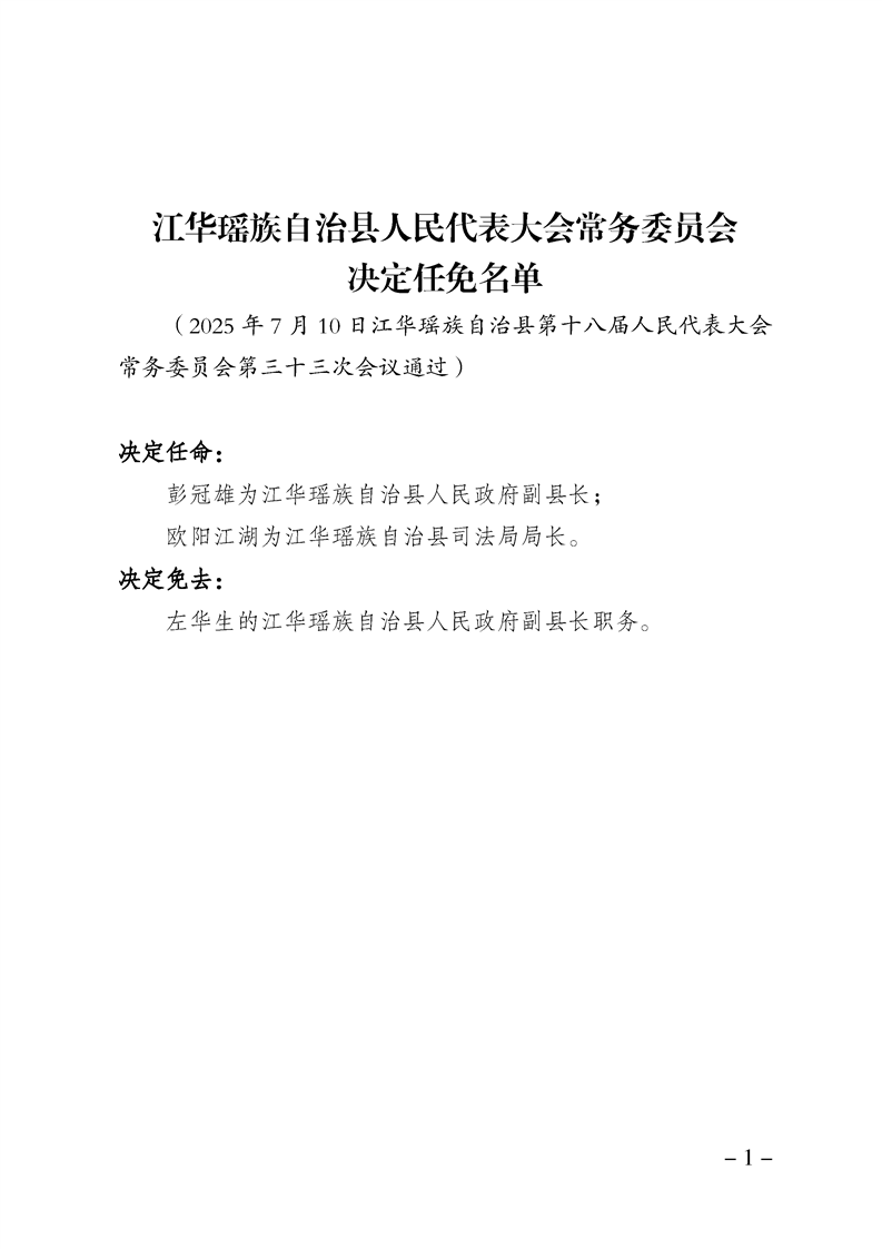 江华瑶族自治县人民代表大会常务委员会决定任免名单
