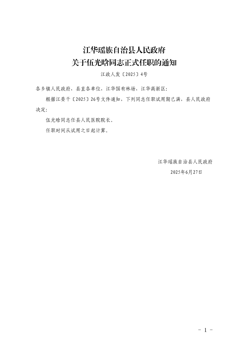 江华瑶族自治县人民政府关于伍光晗同志正式任职的通知
