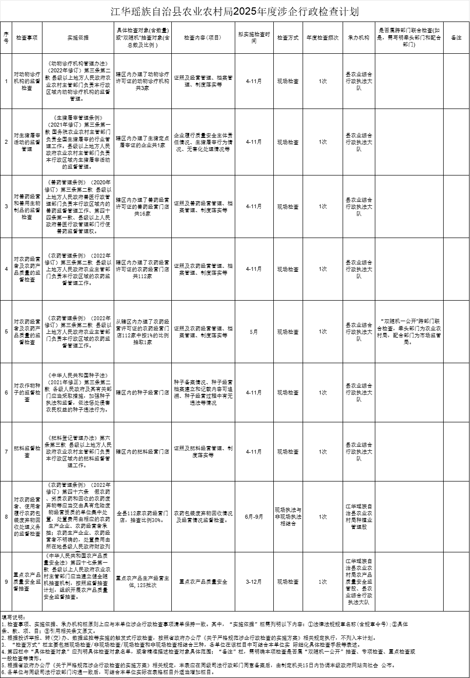 江华瑶族自治县农业农村局2025年度涉企行政检查计划