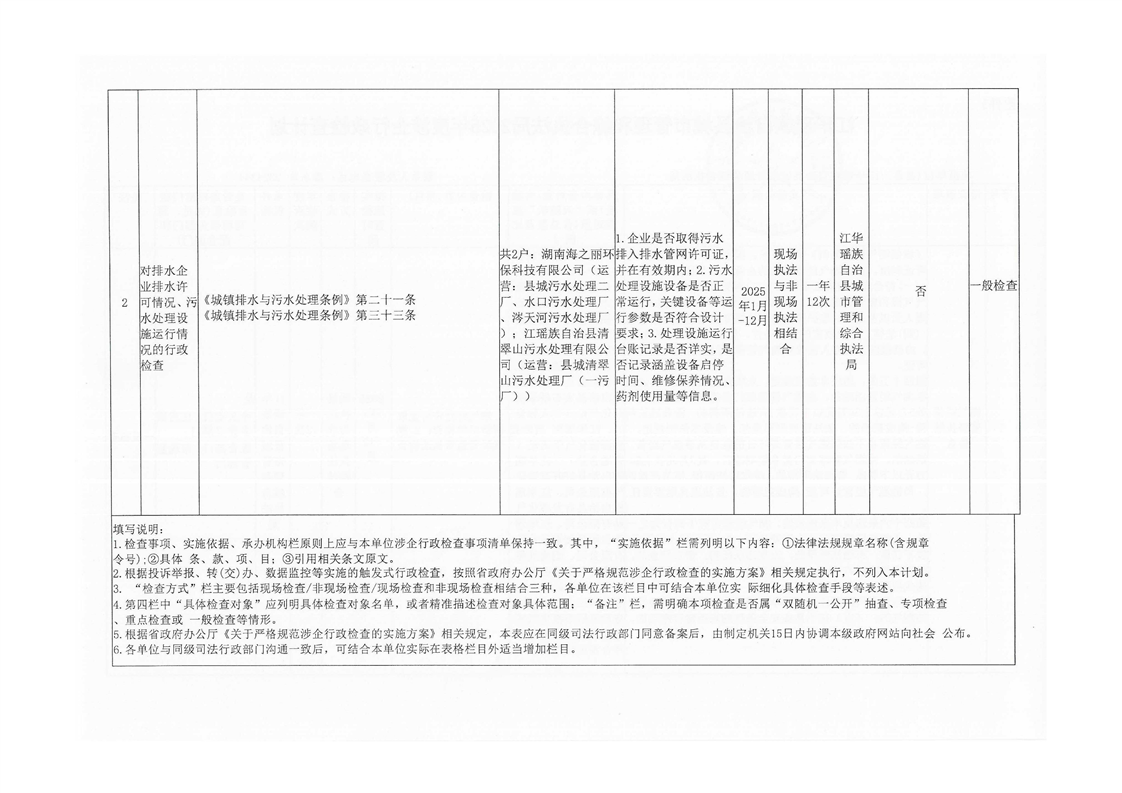 江华瑶族自治县城市管理和综合执法局2025年度涉企行政检查计划