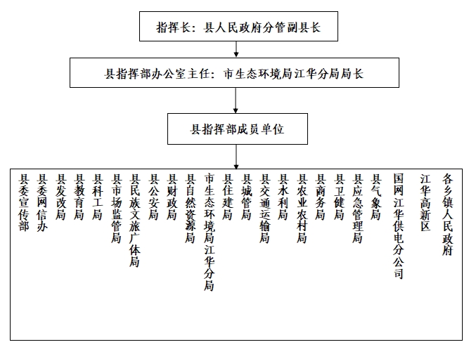 指挥部指挥长由县人民政府分管生态环境工作的副县长担任;副指挥长由县人民政府办公室协助管理生态环境工作的副主任和市生态环境局江华分局局长、县气象局局长担任。