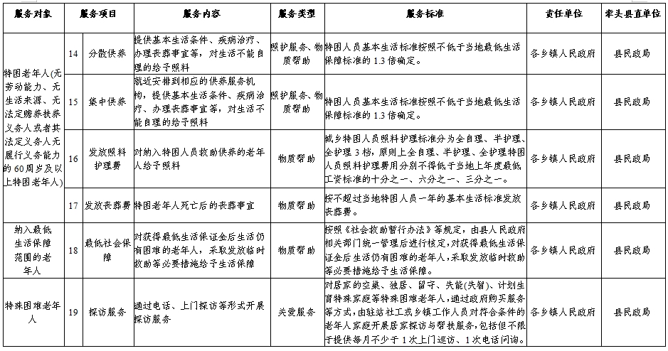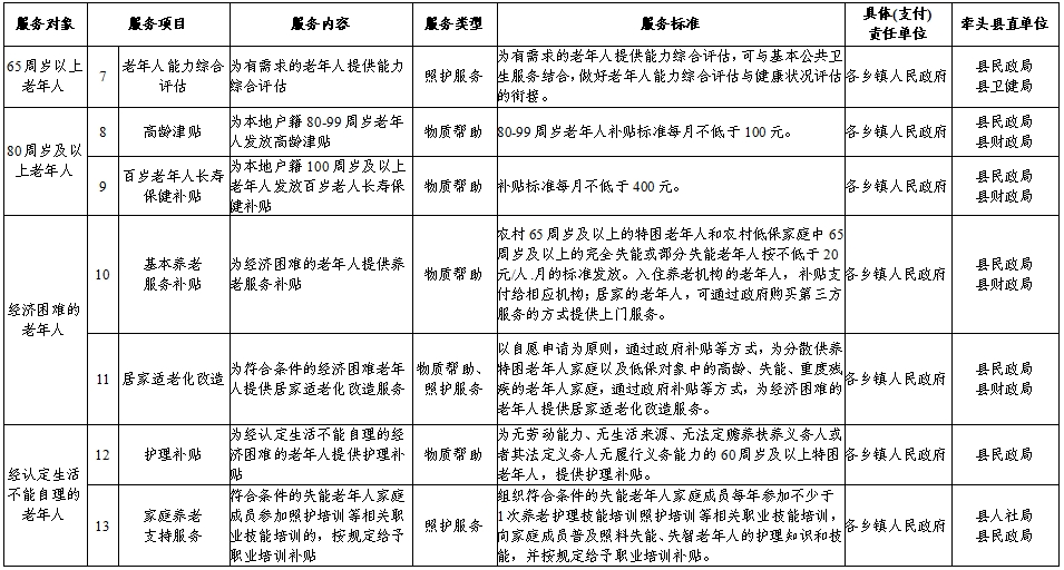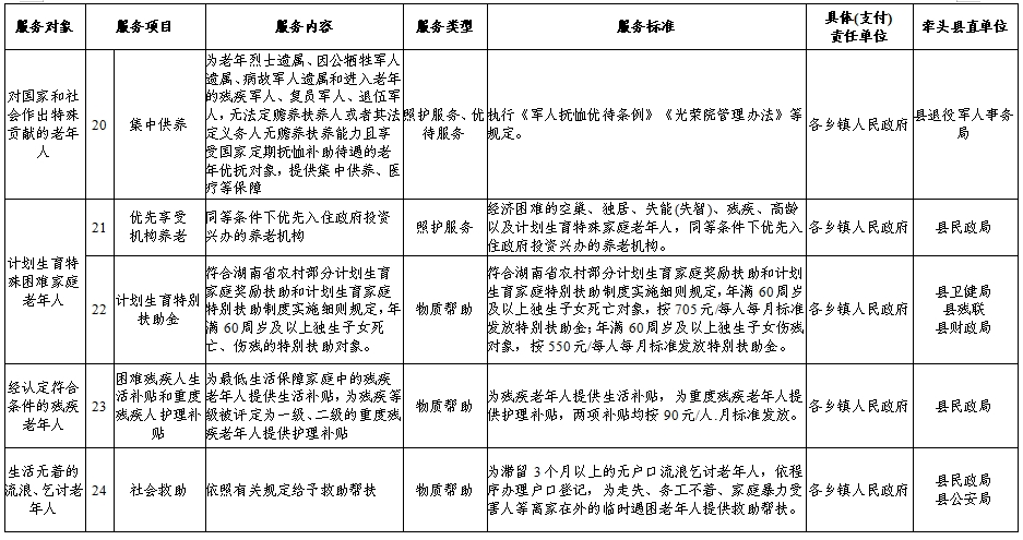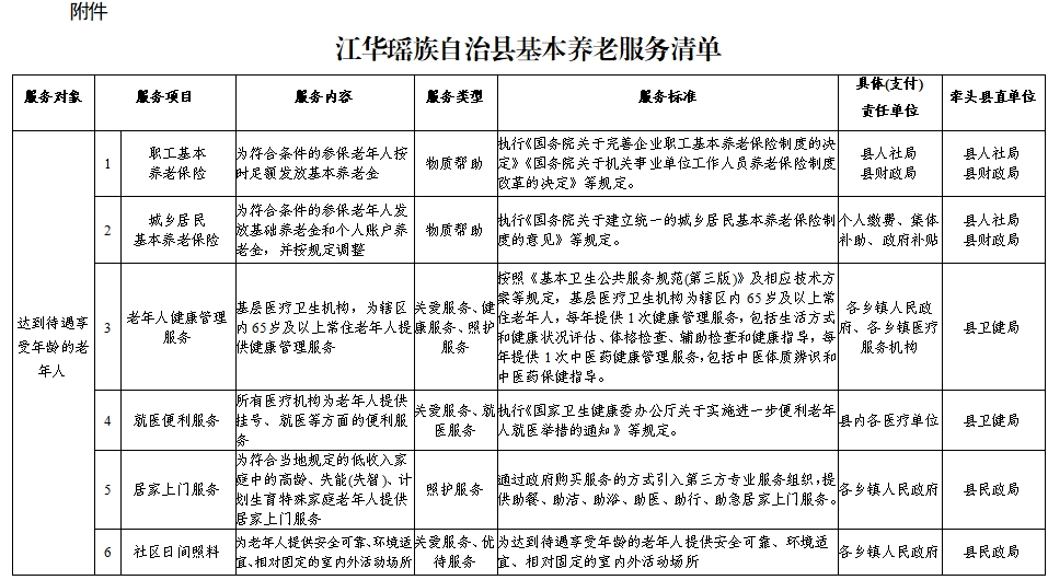 一、制定落实基本养老服务清单。对照《永州市基本养老服务清单》制定并发布《江华瑶族自治县基本养老服务清单》(见附件),明确服务对象、内容、标准及支付责任等;各职能部门要认真抓好清单的组织实施,并根据经济发展水平、老年人养老服务需求,适时调整清单项目,及时公开发布并建立基本养老公共服务清单年度发布制度。(责任单位:县政府办、县直相关单位)