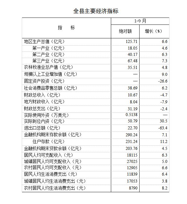(一)地区生产总值。1-9月,全县地区生产总值125.71亿元,按不变价计算,同比增长6.6%,经济运行呈持续回升向好态势。分产业看,第一产业增加值18.05亿元,增长4.6%,第二产业增加值40.17亿元,增长6.3%,第三产业增加值67.48亿元,增长7.3%。