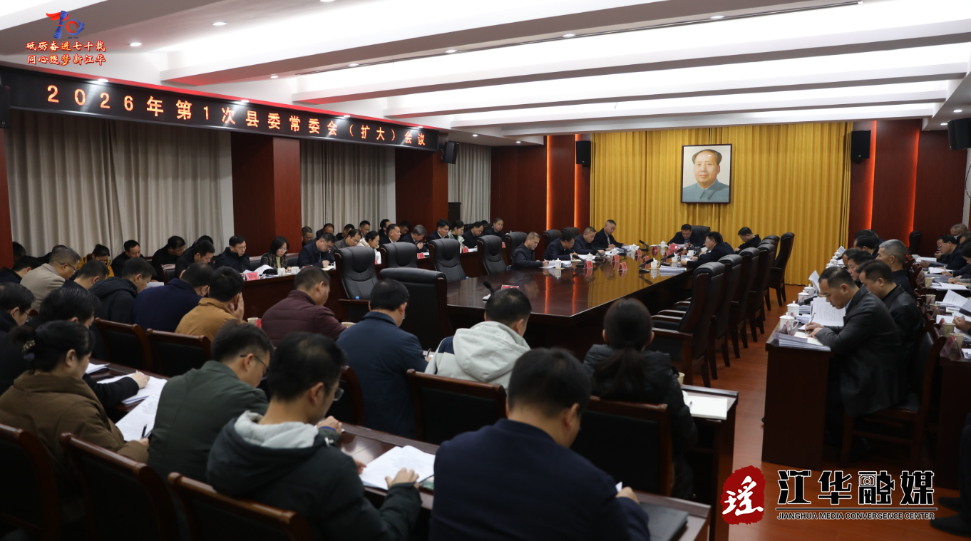 1月4日,受江华县委书记袁章中委托,江华县委副书记、县长吴军臣主持召开2026年第1次县委常委会(扩大)会议,传达学习习近平总书记2026年新年贺词精神、在中央农村工作会议上的重要指示精神、在中共中央政治局民主生活会上的重要讲话精神;传达学习省委十二届十次全体会议暨省委经济工作会议、市委六届九次全会暨市委经济工作会议等会议文件精神;听取当前全县经济形势分析情况汇报,研究部署贯彻落实意见和下一步经济工作。